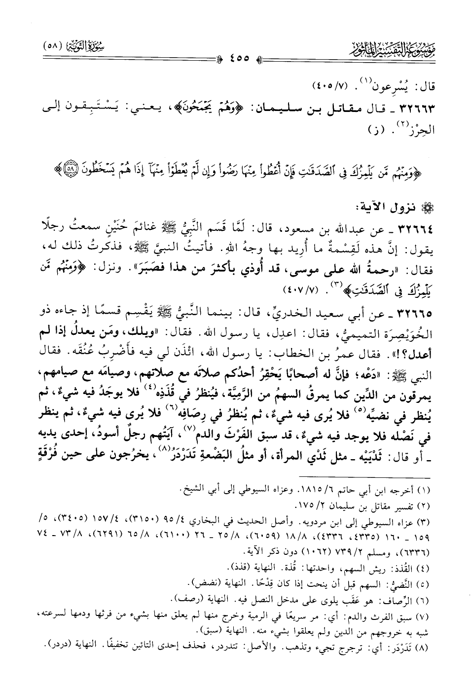 ٣٢٦٦٤ - عن عبد الله بن مسعود، قال: لَمّا قَسَم النَّبِيُّ - صلى الله عليه وسلم - غنائمَ حُنَيْنٍ سمعتُ رجلًا يقول: إنّ هذه لَقِسْمةٌ ما أُرِيد بها وجهُ اللهِ. فأتيتُ النبيَّ - صلى الله عليه وسلم -، فذكرتُ ذلك له، فقال: «رحمةُ الله على موسى، قد أُوذي بأكثرَ من هذا فصَبَرَ». ونزل: {ومنهم مَّن يلمزُك في الصَّدقات} (¬٣). (٧/ ٤٠٧)