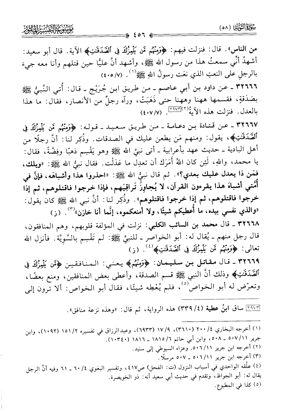 ٣٢٦٦٧ - عن قتادة بن دعامة -من طريق سعيد- قوله: {ومنهم من يلمزك في الصدقات}، يقول: ومنهم مَن يطعن عليك في الصدقات. وذُكِر لنا: أنّ رجلًا من أهل البادية -حديث عهد بأعرابية- أتى نبيَّ الله - صلى الله عليه وسلم - وهو يَقْسِم ذهبًا وفِضَّةً، فقال: يا محمد، واللهِ، لَئِن كان اللهُ أمَرَك أن تعدِل ما عَدَلْت. فقال نبيُّ الله - صلى الله عليه وسلم -: «ويلك، فمَن ذا يعدل عليك بعدي؟». ثم قال نبيُّ الله - صلى الله عليه وسلم -: «احذروا هذا وأشباهَه، فإنّ في أُمَّتي أشباهَ هذا يقرءون القرآن، لا يُجاوِزُ تَراقِيَهم، فإذا خرجوا فاقتلوهم، ثم إذا خرجوا فاقتلوهم، ثم إذا خرجوا فاقتلوهم». وذُكِر لنا: أنّ نبي الله - صلى الله عليه وسلم - كان يقول: «والذي نفسي بيده، ما أُعطيكم شيئًا، ولا أمنعكموه، إنّما أنا خازن» (¬٣). (ز)
