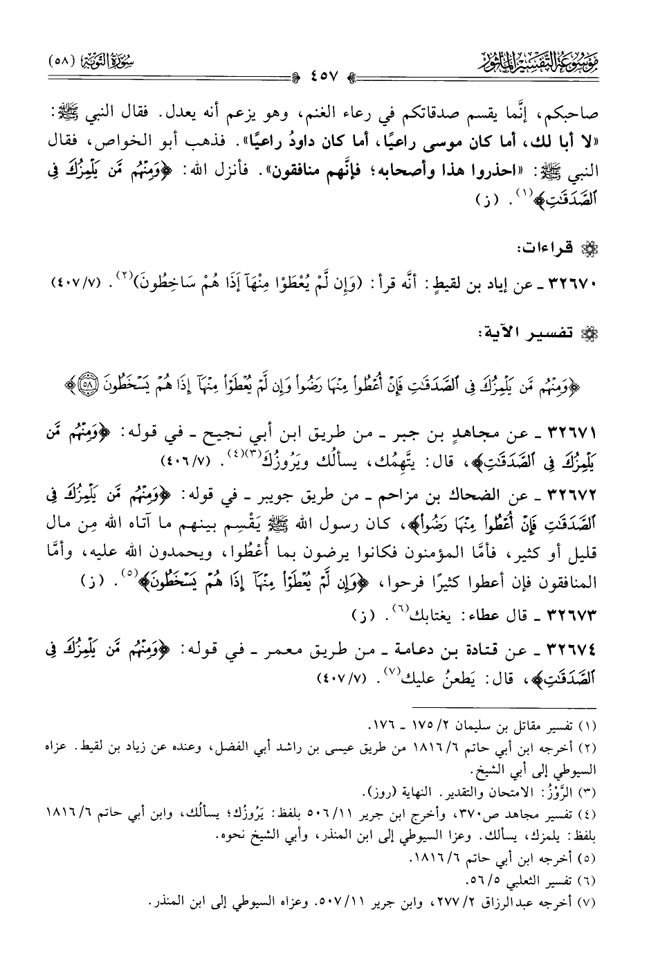 ٣٢٦٧٢ - عن الضحاك بن مزاحم -من طريق جويبر- في قوله: {ومنهم من يلمزك في الصدقات فإن أعطوا منها رضوا}، كان رسول الله - صلى الله عليه وسلم - يَقْسِم بينهم ما آتاه الله مِن مال قليل أو كثير، فأمّا المؤمنون فكانوا يرضون بما أُعْطُوا، ويحمدون الله عليه، وأمّا المنافقون فإن أعطوا كثيرًا فرحوا، {وإن لم يعطوا منها إذا هم يسخطون} (¬٥). (ز)