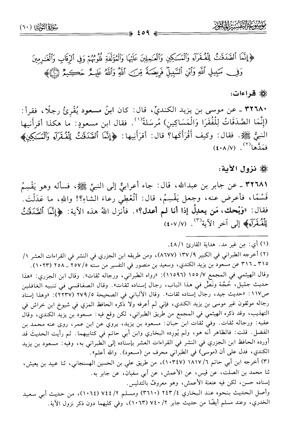 ٣٢٦٨١ - عن جابر بن عبد الله، قال: جاء أعرابيٌّ إلى النبيِّ - صلى الله عليه وسلم -، فسأله وهو يَقْسِمُ قَسْمًا، فأعرض عنه، وجعل يَقْسِمُ، قال: أتُعْطِي رعاءَ الشاءِ؟! واللهِ، ما عَدَلْتَ. فقال: «ويْحك، مَن يعدِلُ إذا أنا لم أعدل؟». فأنزل اللهُ هذه الآية: {إنمّا الصدقاتُ للفقراءِ} إلى آخر الآية (¬٣). (٧/ ٤٠٧)