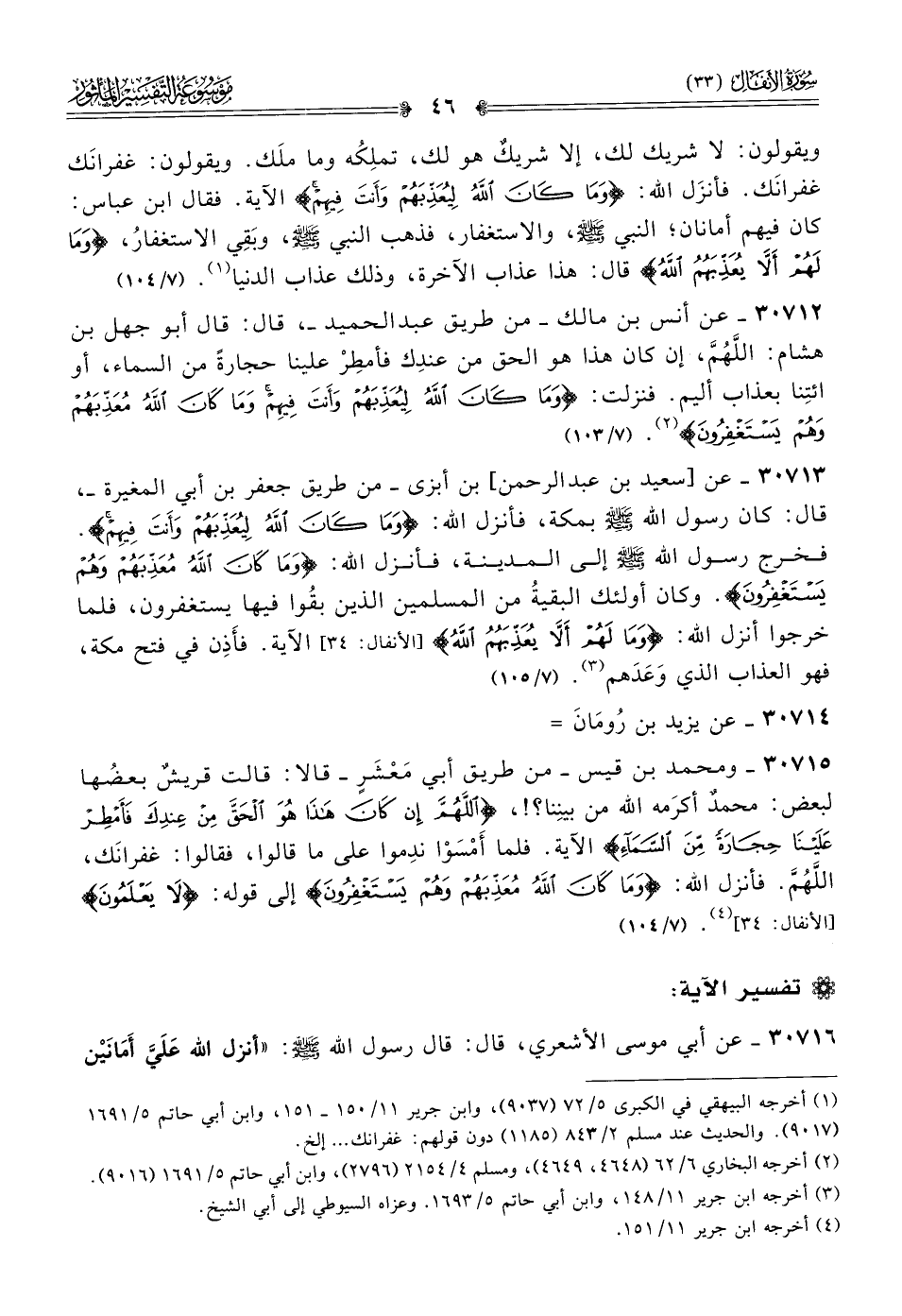 ٣٠٧١٢ - عن أنس بن مالك -من طريق عبد الحميد-، قال: قال أبو جهل بن هشام: اللهمَّ، إن كان هذا هو الحق من عندِك فأمطِرْ علينا حجارةً من السماء، أو ائتِنا بعذاب أليم. فنزلت: {وما كان الله ليعذبهم وأنت فيهم وما كان الله معذبهم وهم يستغفرون} (¬٢). (٧/ ١٠٣)