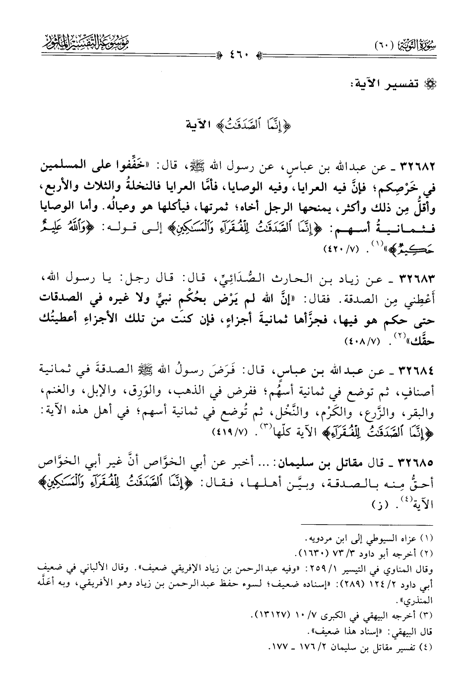 ٣٢٦٨٤ - عن عبد الله بن عباسٍ، قال: فَرَضَ رسولُ الله - صلى الله عليه وسلم - الصدقةَ في ثمانية أصنافٍ، ثم توضع في ثمانية أسهُم؛ ففرض في الذهب، والوَرِق، والإبل، والغنم، والبقر، والزَّرع، والكَرْم، والنَّخْل، ثم تُوضع في ثمانية أسهم؛ في أهل هذه الآية: {إنّما الصدقاتُ للفقراء} الآية كلّها (¬٣). (٧/ ٤١٩)