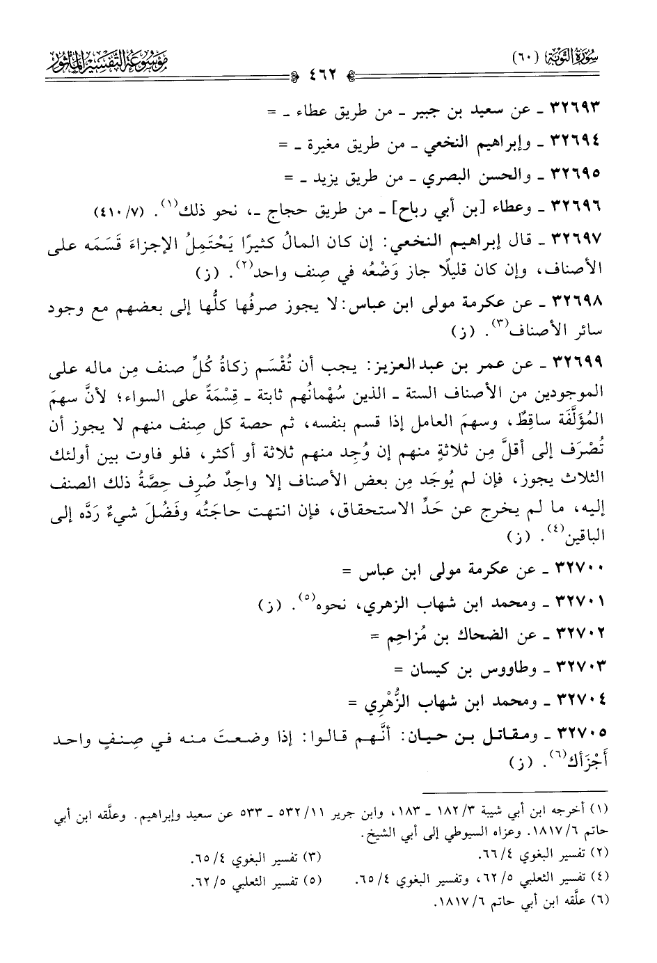 ٣٢٧٠٥ - ومقاتل بن حيان أنّهم قالوا: إذا وضعتَ منه في صِنفٍ واحد أجْزَأك (¬٦). (ز)