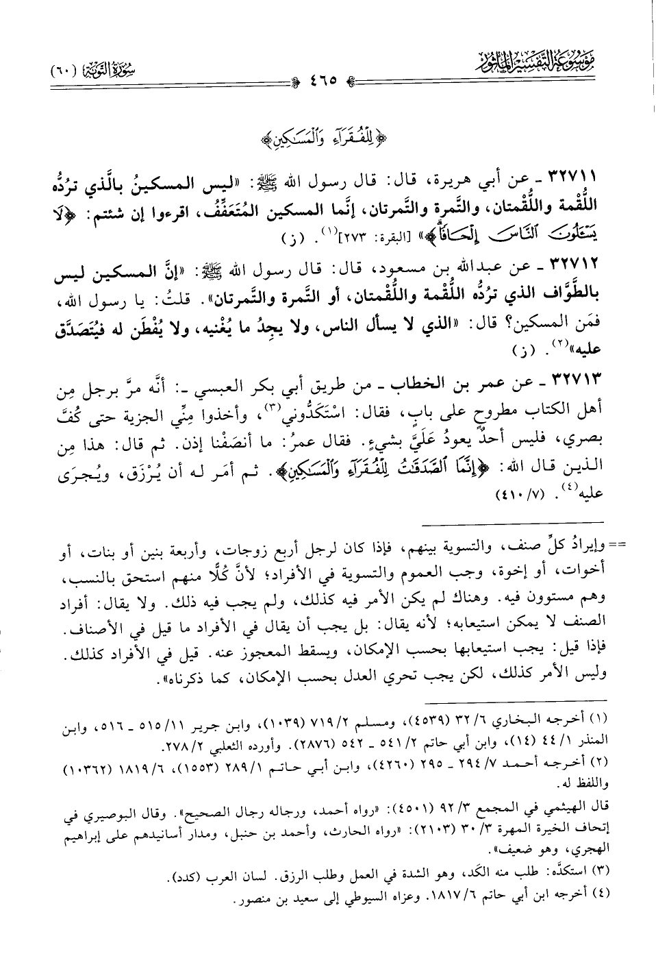 ٣٢٧١٣ - عن عمر بن الخطاب -من طريق أبي بكر العبسي- أنّه مرَّ برجل مِن أهل الكتاب مطروحٍ على بابٍ، فقال: اسْتَكَدُّوني (¬٣)، وأخذوا مِنِّي الجزية حتى كُفَّ بصري، فليس أحدٌ يعودُ عَلَيَّ بشيءٍ. فقال عمرُ: ما أنصَفْنا إذن. ثم قال: هذا مِن الذين قال الله: {إنّما الصدقاتُ للفُقراءِ والمساكينِ}. ثم أمَر له أن يُرْزَق، ويُجرى عليه (¬٤). (٧/ ٤١٠)