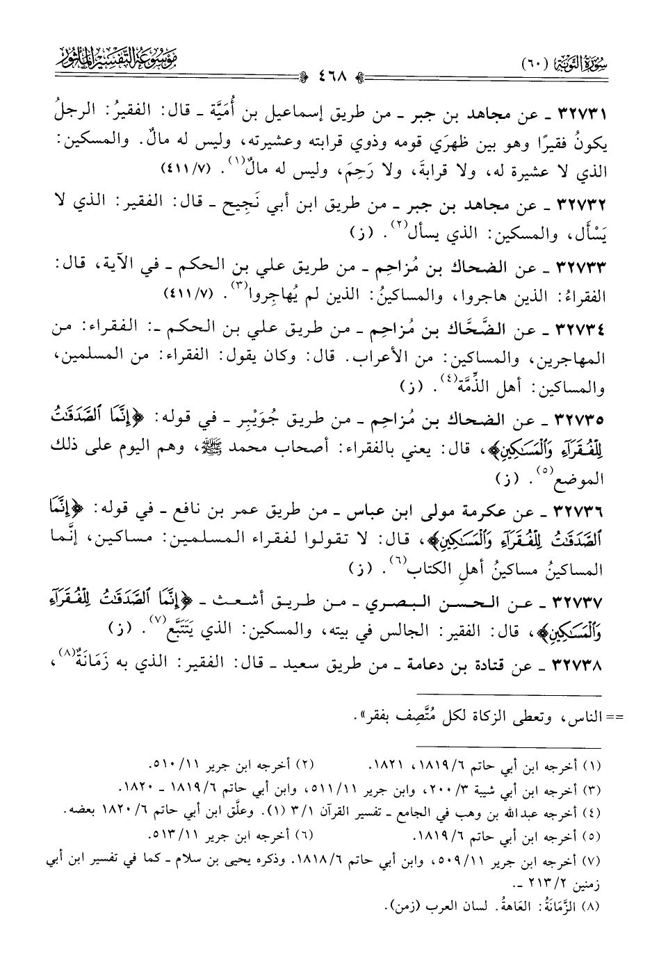 ٣٢٧٣٥ - عن الضحاك بن مُزاحِم -من طريق جُوَيْبِر- في قوله: {إنما الصدقات للفقراء والمساكين}، قال: يعني بالفقراء: أصحاب محمد - صلى الله عليه وسلم -، وهم اليوم على ذلك الموضع (¬٥). (ز)