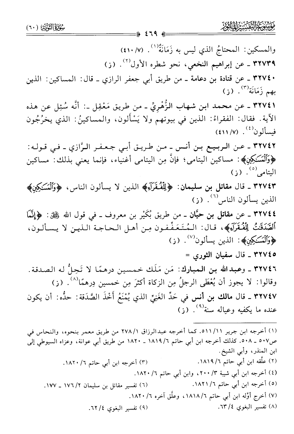 ٣٢٧٤١ - عن محمد ابن شهاب الزُّهْرِيِّ -من طريق مَعْقِل- أنّه سُئِل عن هذه الآية. فقال: الفقراءُ: الذين في بيوتهم ولا يَسْأَلون، والمساكينُ: الذي يخرُجُون فيسألون (¬٤). (٧/ ٤١١)