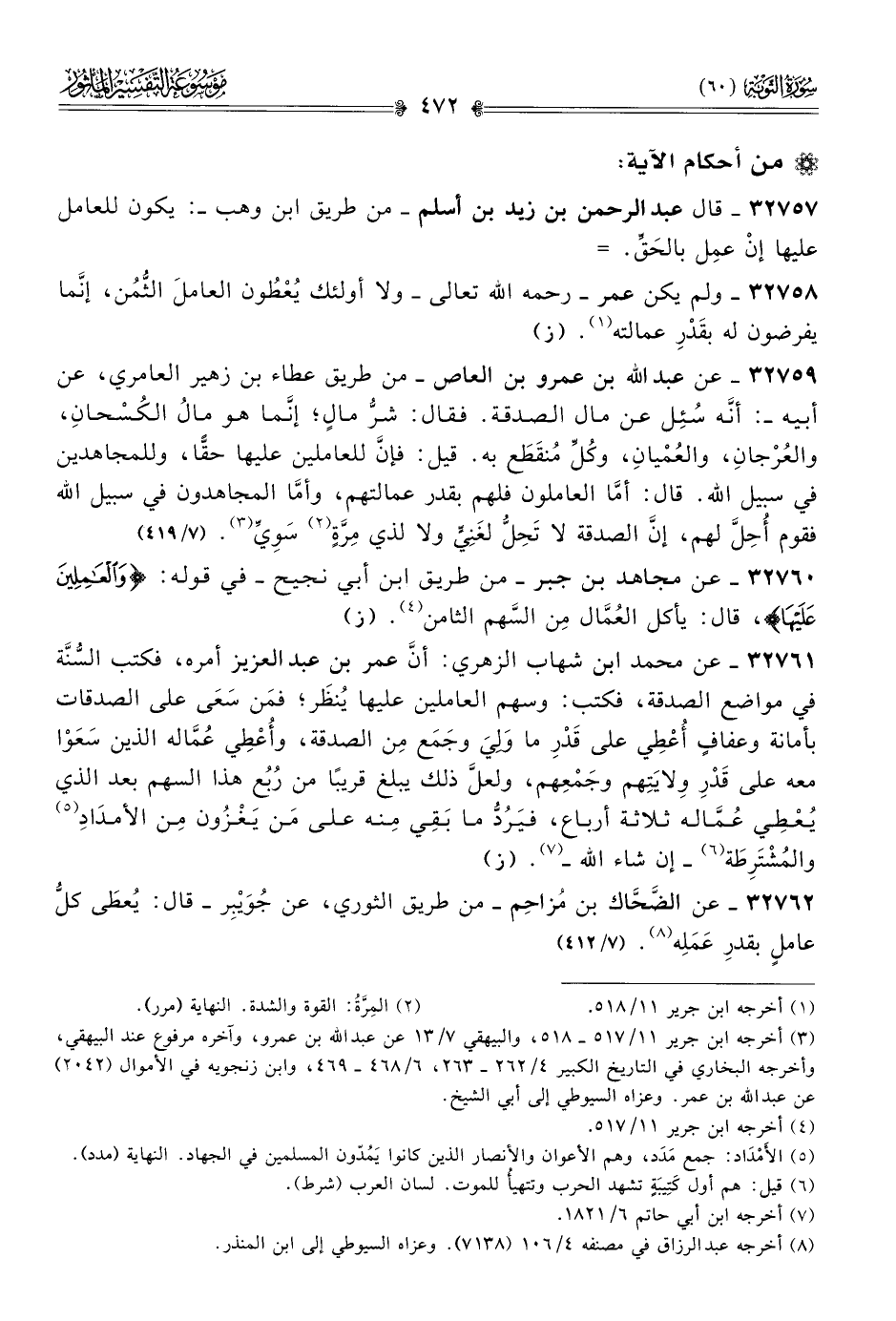 ٣٢٧٦٠ - عن مجاهد بن جبر -من طريق ابن أبي نجيح- في قوله: {والعاملين عليها}، قال: يأكل العُمّال مِن السَّهم الثامن (¬٤). (ز)