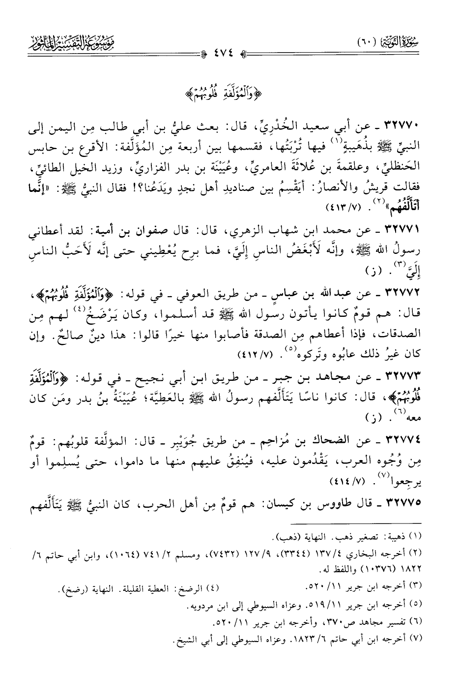 ٣٢٧٧٤ - عن الضحاك بن مُزاحِم -من طريق جُوَيْبِر- قال: المؤلَّفة قلوبُهم: قومٌ مِن وُجُوه العرب، يَقْدُمون عليه، فيُنفِقُ عليهم منها ما داموا، حتى يُسلِموا أو يرجِعوا (¬٧). (٧/ ٤١٤)
