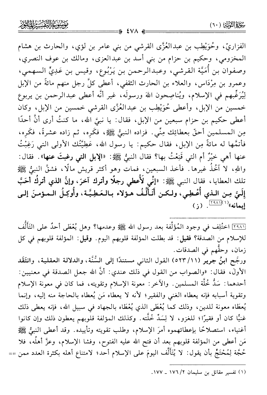 الفزاريّ، وحُوَيْطِب بن عبد العُزّى القرشي من بني عامر بن لؤي، والحارث بن هشام المخزومي، وحكيم بن حزام من بني أسد بن عبد العزى، ومالك بن عوف النصري، وصفوان بن أُمَيَّة القرشي، وعبد الرحمن بن يَرْبُوع، وقيس بن عَدِيٍّ السهمي، وعمرو بن مِرْداس، والعلاء بن الحارث الثقفي، أعطى كلَّ رجل منهم مائةً من الإبل لِيُرَغِّبهم في الإسلام، ويُناصِحون اللهَ ورسولَه، غير أنّه أعطى عبد الرحمن بن يربوع خمسين من الإبل، وأعطى حُوَيْطِب بن عبد العُزّى القرشي خمسين من الإبل، وكان أعطى حكيم بن حزام سبعين من الإبل، فقال: يا نبيَّ الله، ما كنتُ أرى أنّ أحدًا مِن المسلمين أحقّ بعطائِك مِنِّي. فزاده النبيُّ - صلى الله عليه وسلم -، فكَرِه، ثم زاده عشرةً، فكَرِه، فأتمَّها له مائةً مِن الإبل، فقال حكيم: يا رسول الله، عَطِيَّتُك الأولى التي رَغِبْتُ عنها أهي خيْرٌ أم التي قَنِعْتُ بها؟ فقال النبيُّ - صلى الله عليه وسلم -: «الإبل التي رغبتَ عنها». فقال: واللهِ، لا آخُذُ غيرها. فأخذ السبعين، فمات وهو أكثر قريش مالًا، فشقَّ النبيُّ - صلى الله عليه وسلم - تلك العطايا، فقال النبي - صلى الله عليه وسلم -: «إنِّي لَأُعطي رجلًا وأترك آخرَ، وإنّ الذي أتركُ أحَبَّ إلَيَّ مِن الذي أُعْطِي، ولكن أتَأَلَّفُ هؤلاء بالعَطِيَّة، وأُوكِلُ المؤمنَ إلى إيمانه» (¬١) [٢٩٨١]. (ز)
