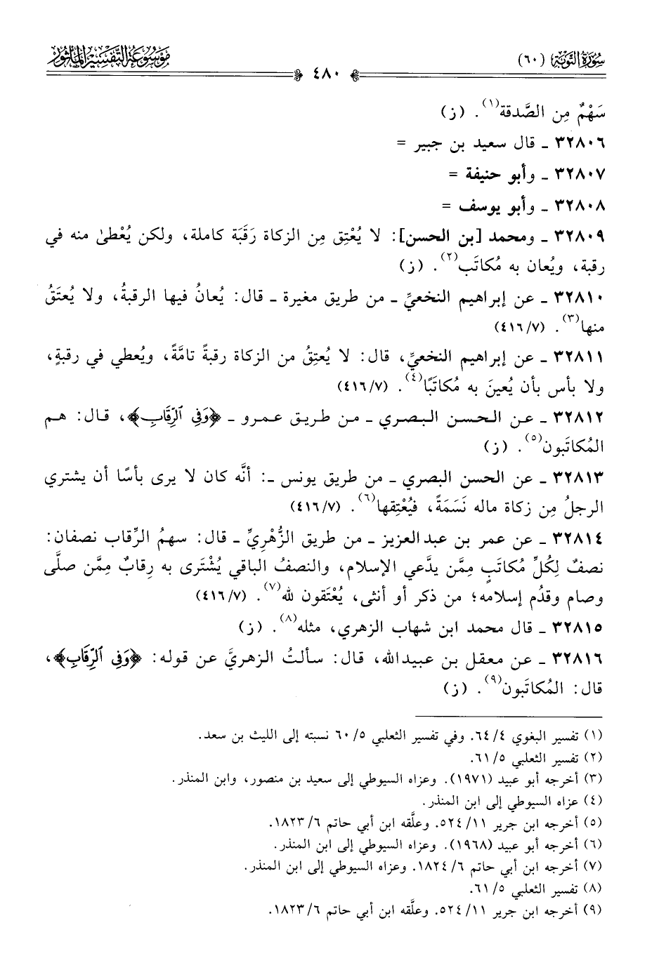 ٣٢٨١٢ - عن الحسن البصري -من طريق عمرو- {وفي الرقاب}، قال: هم المُكاتَبون (¬٥). (٧/ ٤١٦)