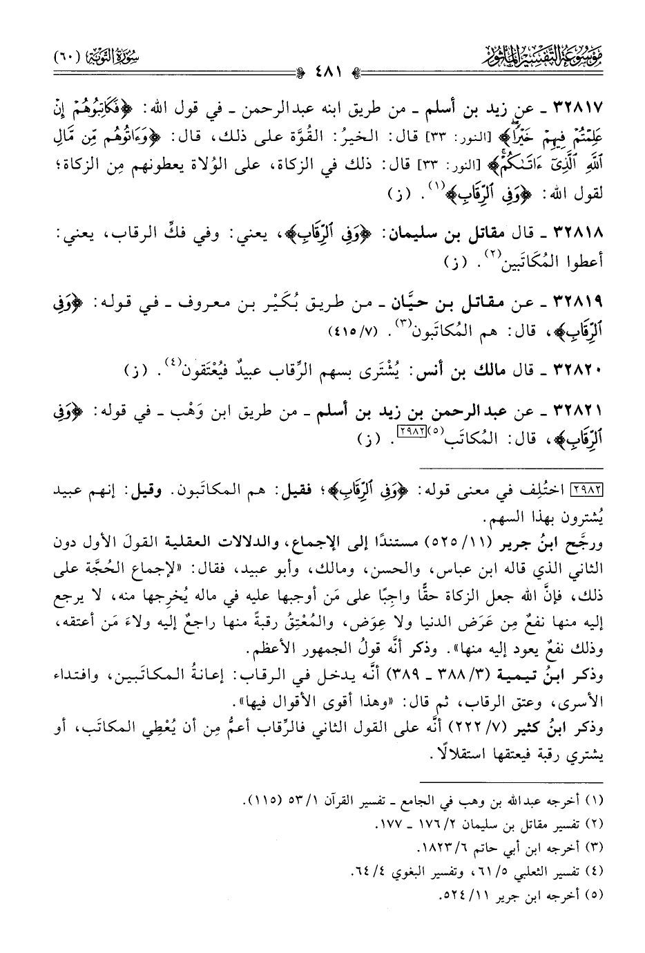 ٣٢٨٢١ - عن عبد الرحمن بن زيد بن أسلم -من طريق ابن وهْب- في قوله: {وفي الرقاب}، قال: المُكاتَب (¬٥) [٢٩٨٢]. (ز)
