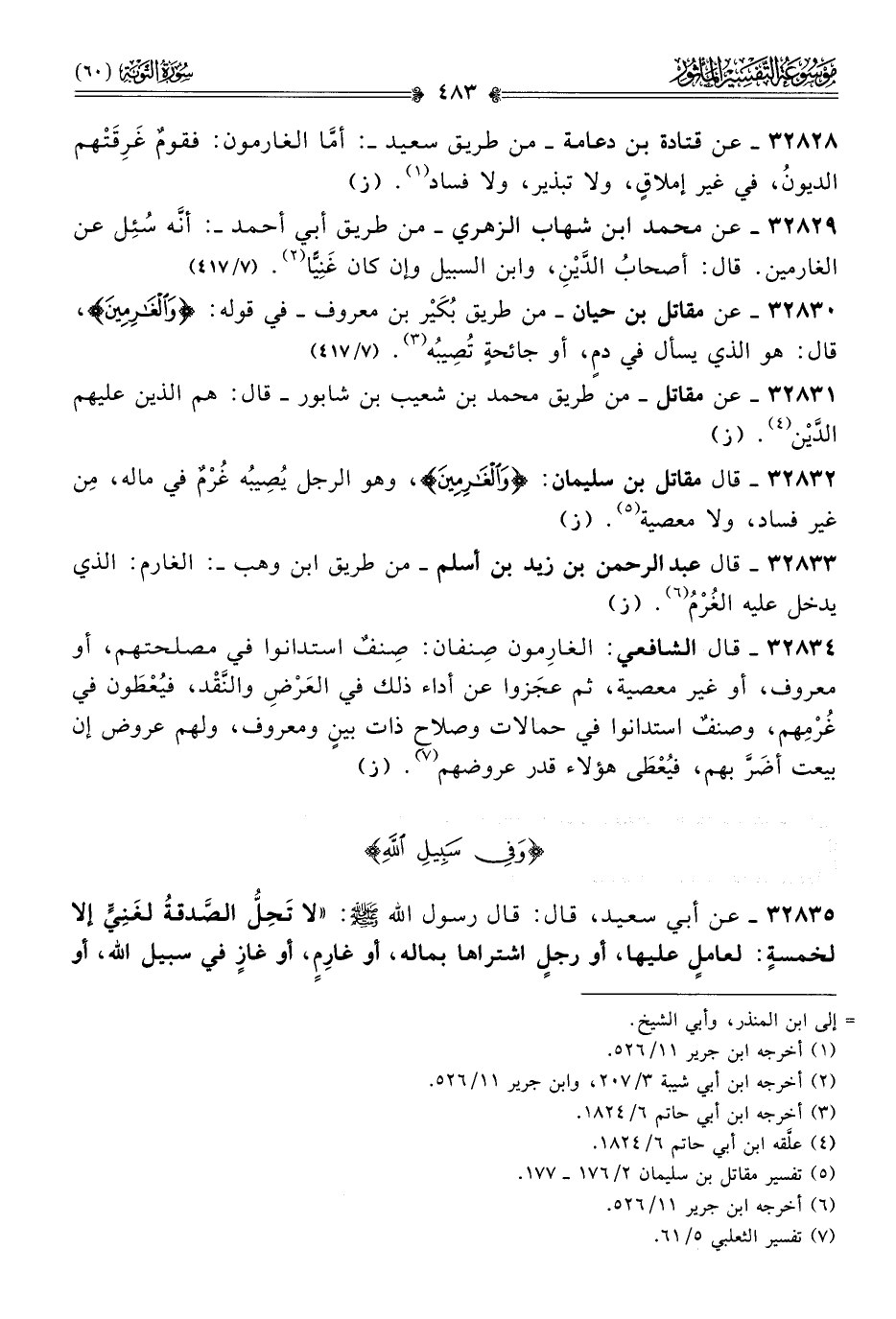 ٣٢٨٣٣ - قال عبد الرحمن بن زيد بن أسلم -من طريق ابن وهب-: الغارم: الذي يدخل عليه الغُرْمُ (¬٦). (ز)