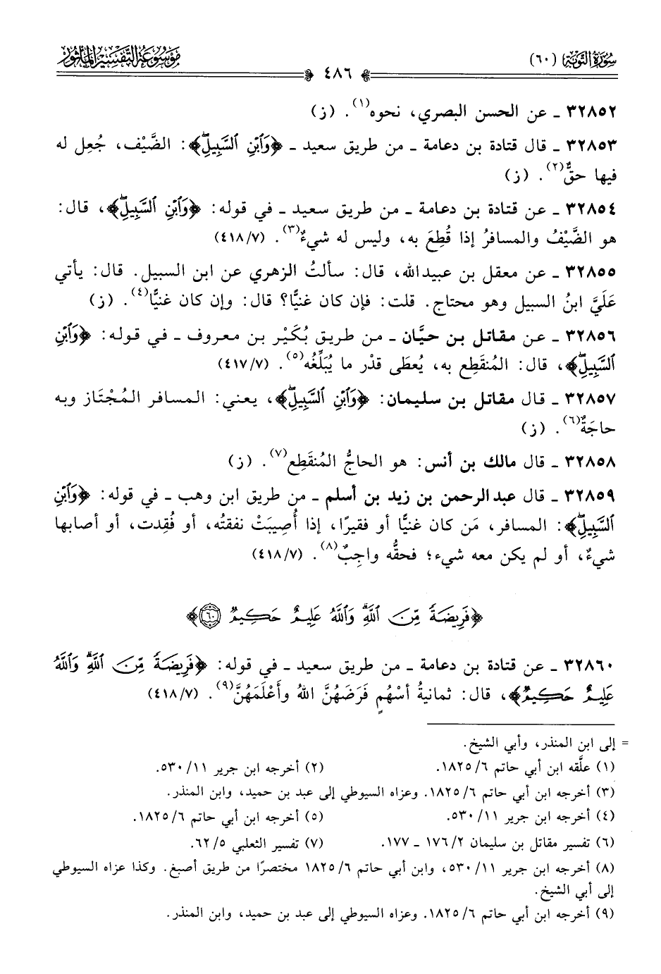 ٣٢٨٥٤ - عن قتادة بن دعامة -من طريق سعيد- في قوله: {وابن السبيل}، قال: هو الضَّيْفُ والمسافرُ إذا قُطِعَ به، وليس له شيءٌ (¬٣). (٧/ ٤١٨)