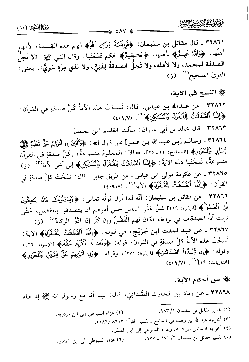 ٣٢٨٦٧ - عن عبد الملك ابن جُرَيْج، في قوله: {إنّما الصَّدقاتُ للفُقراء} الآية: نَسَخَتْ هذه الآيةُ كلَّ صدقةٍ في القران؛ قوله: {وءات ذا القُربى حَقَّه} [الإسراء: ٢٦]، وقوله: {إن تُبْدُوا الصَّدقات} [البقرة: ٢٧١]، وقوله: {وفي أموالهم حقٌ للسائل والمحروم} [الذاريات: ١٩] (¬٦). (٧/ ٤٠٩)