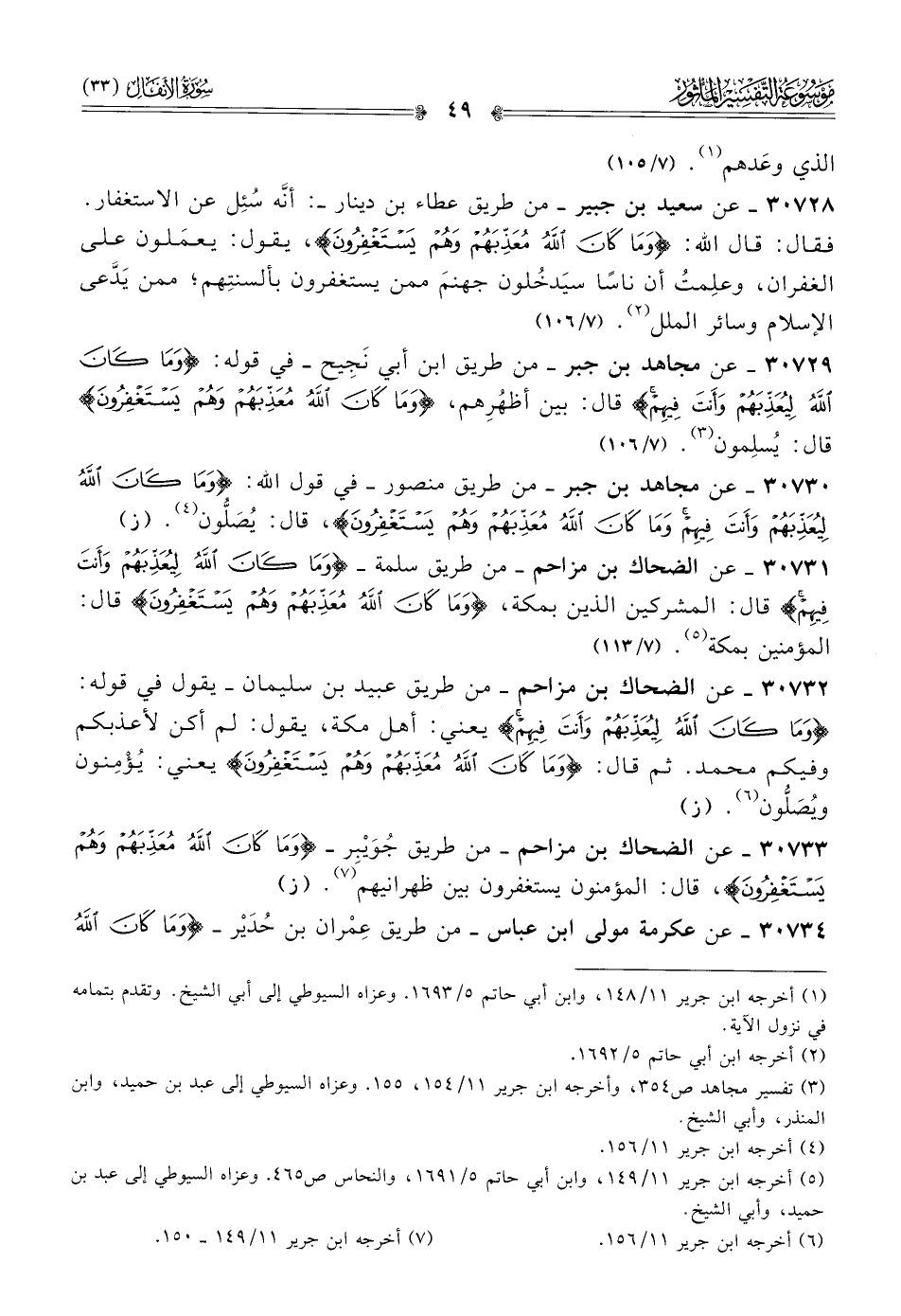٣٠٧٢٩ - عن مجاهد بن جبر -من طريق ابن أبي نَجِيح- في قوله: {وما كان الله ليعذبهم وأنت فيهم} قال: بين أظهُرِهم، {وما كان الله معذبهم وهم يستغفرون} قال: يُسلِمون (¬٣). (٧/ ١٠٦)