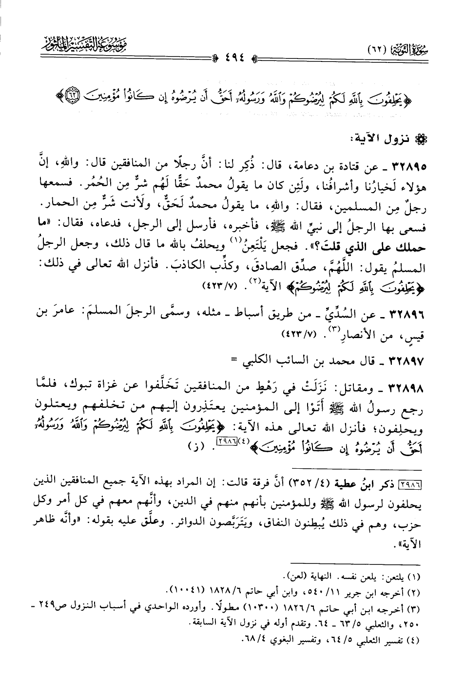 ٣٢٨٩٨ - ومقاتل: نَزَلَتْ في رَهْطٍ من المنافقين تَخَلَّفوا عن غزاة تبوك، فلمّا رجع رسولُ الله - صلى الله عليه وسلم - أتَوْا إلى المؤمنون يعتذَرِون إليهم من تخلفهم ويعتلون ويحلِفون؛ فأنزل الله تعالى هذه الآية: {يحلفون بالله لكم ليرضوكم والله ورسوله أحق أن يرضوه إن كانوا مؤمنين} (¬٤) [٢٩٨٦]. (ز)