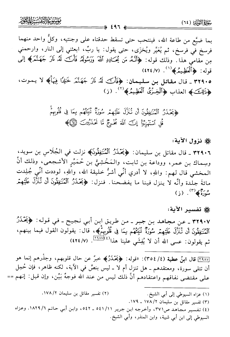 ٣٢٩٠٦ - قال مقاتل بن سليمان: {يَحْذَرُ المُنافِقُونَ} نزلت في الجُلاسِ بن سويد، وسِماك بن عمر، ووداعة بن ثابت، والمَخْشِيُّ بن حُمَيِّرٍ الأشجعى، وذلك أنّ المخشي قال لهم: واللهِ، لا أدري أنِّي أشرُّ خليقة الله، واللهِ، لوددت أنِّي جُلِدت مائةَ جلدة وأنّه لا ينزل فينا ما يفضحنا. فنزل: {يَحْذَرُ المُنافِقُونَ أنْ تُنَزَّلَ عَلَيْهِمْ سُورَةٌ} (¬٣). (ز)