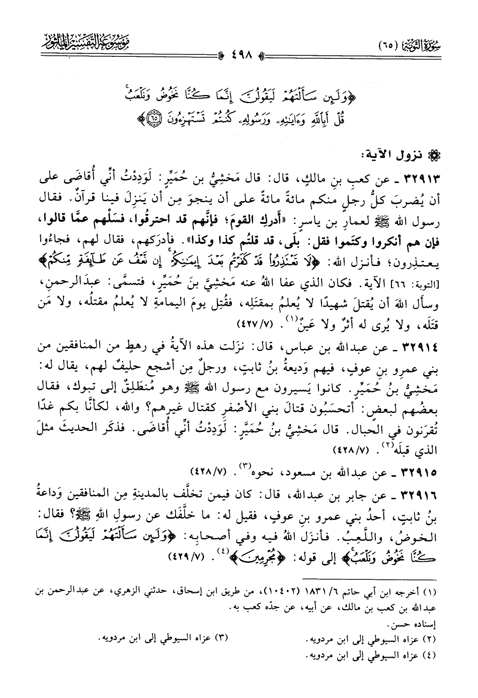 ٣٢٩١٦ - عن جابر بن عبد الله، قال: كان فيمن تخلَّف بالمدينةِ مِن المنافقين وداعةُ بنُ ثابتٍ، أحدُ بني عمرو بنِ عوفٍ، فقيل له: ما خلَّفَك عن رسولِ اللهِ - صلى الله عليه وسلم -؟ فقال: الخوضُ، واللَّعِبُ. فأنزَل اللهُ فيه وفي أصحابِه: {ولَئِن سَأَلْتَهُم لَيَقُولُنَّ إنَّما كُنّا نَخُوضُ ونَلعَبُ} إلى قوله: {مجُرِمِينَ} (¬٤). (٧/ ٤٢٩)