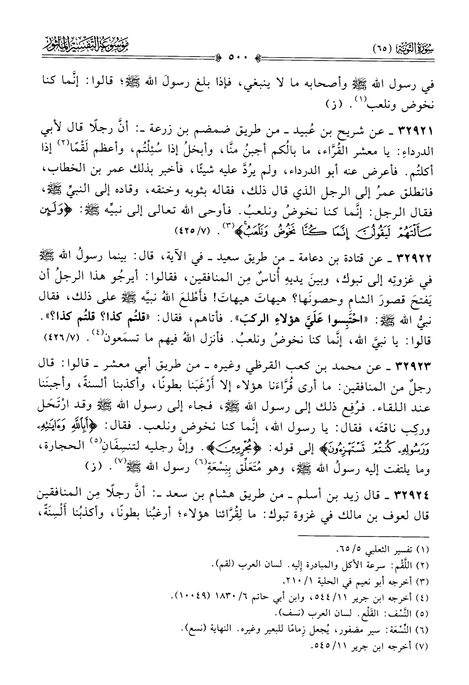 ٣٢٩٢٣ - عن محمد بن كعب القرظي وغيره -من طريق أبي معشر- قالوا: قال رجلٌ من المنافقين: ما أرى قُرّاءَنا هؤلاء إلا أرْغَبَنا بطونًا، وأكذبنا ألسنةً، وأجبنَنا عند اللقاء. فرُفِع ذلك إلى رسول الله - صلى الله عليه وسلم -، فجاء إلى رسول الله - صلى الله عليه وسلم - وقد ارْتَحَل وركِب ناقتَه، فقال: يا رسول الله، إنّما كنا نخوض ونلعب. فقال: {أبالله وآياته ورسوله كنتم تستهزئون} إلى قوله: {مجرمين}. وإنّ رجليه لتنسِفانِ (¬٥) الحجارة، وما يلتفت إليه رسولُ الله - صلى الله عليه وسلم -، وهو مُتَعَلِّق بِنِسْعَةِ (¬٦) رسول الله - صلى الله عليه وسلم - (¬٧). (ز)