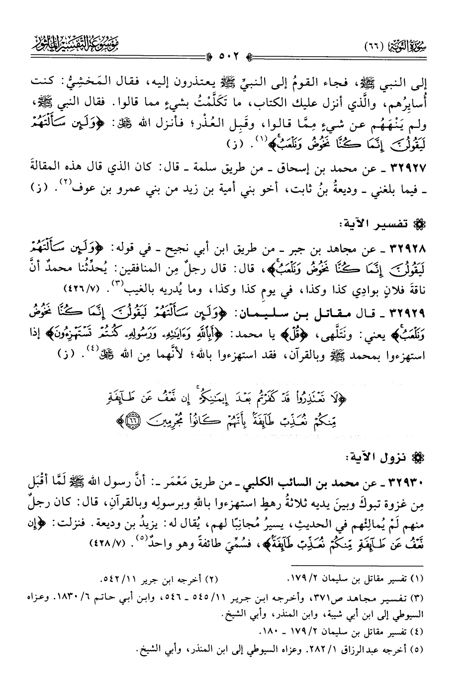 ٣٢٩٣٠ - عن محمد بن السائب الكلبي -من طريق مَعْمَر-: أنّ رسول الله - صلى الله عليه وسلم - لَمّا أقْبَل مِن غزوة تبوكَ وبينَ يديه ثلاثةُ رهطٍ استهزءوا باللهِ وبرسولِه وبالقرآنِ، قال: كان رجلٌ منهم لَمْ يُمالِئْهم في الحديثِ، يسيرُ مُجانِبًا لهم، يُقال له: يزيدُ بن وديعة. فنزلت: {إن نَّعْفُ عَن طَآئِفَةٍ مِنكُم نُعَذِبْ طائِفَةَ}، فسُمِّيَ طائفةً وهو واحدٌ (¬٥). (٧/ ٤٢٨)