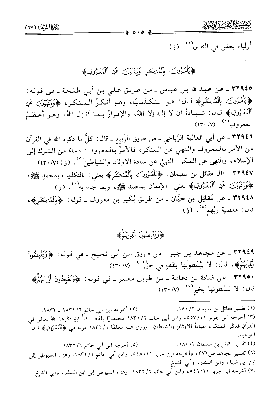 ٣٢٩٤٧ - قال مقاتل بن سليمان: {يَأمُرُونَ بِالمُنْكَرِ} يعني: بالتكذيب بمحمدٍ - صلى الله عليه وسلم -، {ويَنْهَوْنَ عَنِ المَعْرُوفِ} يعني: الإيمان بمحمد - صلى الله عليه وسلم -، وبما جاء به (¬٤). (ز)