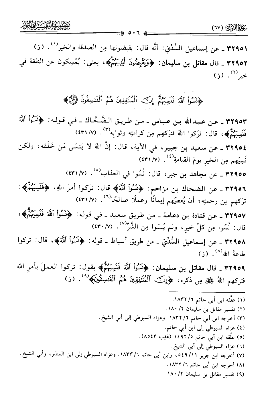 ٣٢٩٥٧ - عن قتادة بن دعامة -من طريق سعيد- في قوله: {نَسُوا اللهَ فَنَسِيَهُم}، قال: نُسُوا مِن كلِّ خيرٍ، ولم يُنسَوا مِن الشَّرِّ (¬٧). (٧/ ٤٣٠)