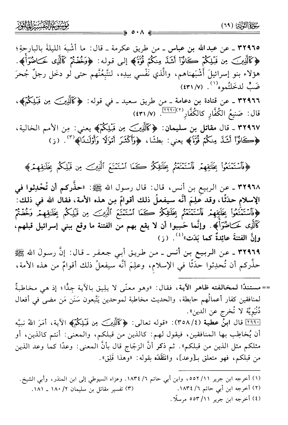 ٣٢٩٦٦ - عن قتادة بن دعامة -من طريق سعيد- في قوله: {كالَّذِينَ مِن قَبلِكُم}، قال: صَنيعُ الكُفّارِ كالكُفّارِ (¬٢) [٢٩٩٠]. (٧/ ٤٣١)