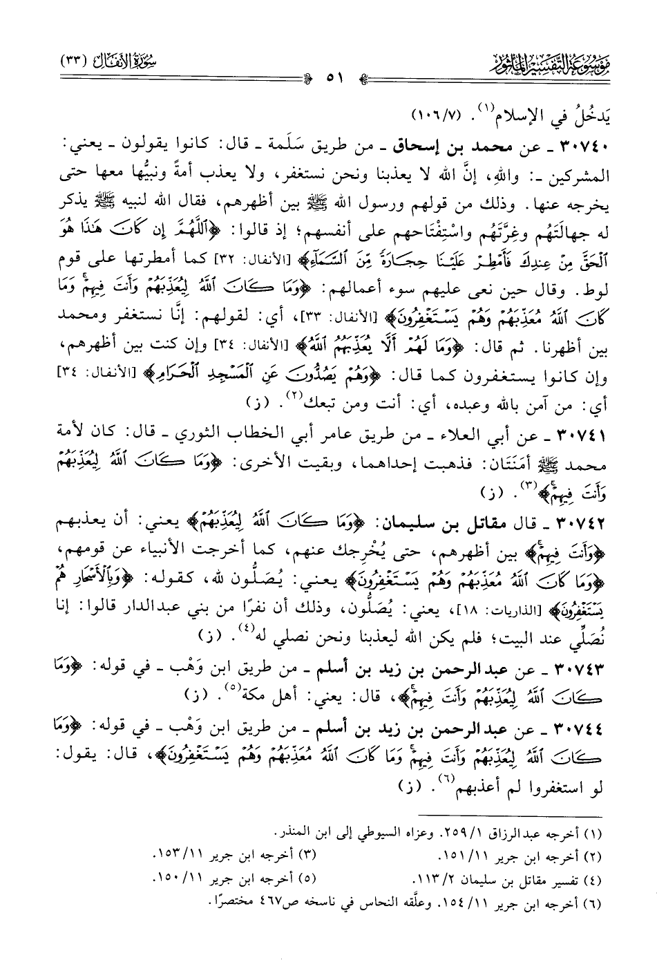 ٣٠٧٤٤ - عن عبد الرحمن بن زيد بن أسلم -من طريق ابن وهْب- في قوله: {وما كان الله ليعذبهم وأنت فيهم وما كان الله معذبهم وهم يستغفرون}، قال: يقول: لو استغفروا لم أعذبهم (¬٦). (ز)