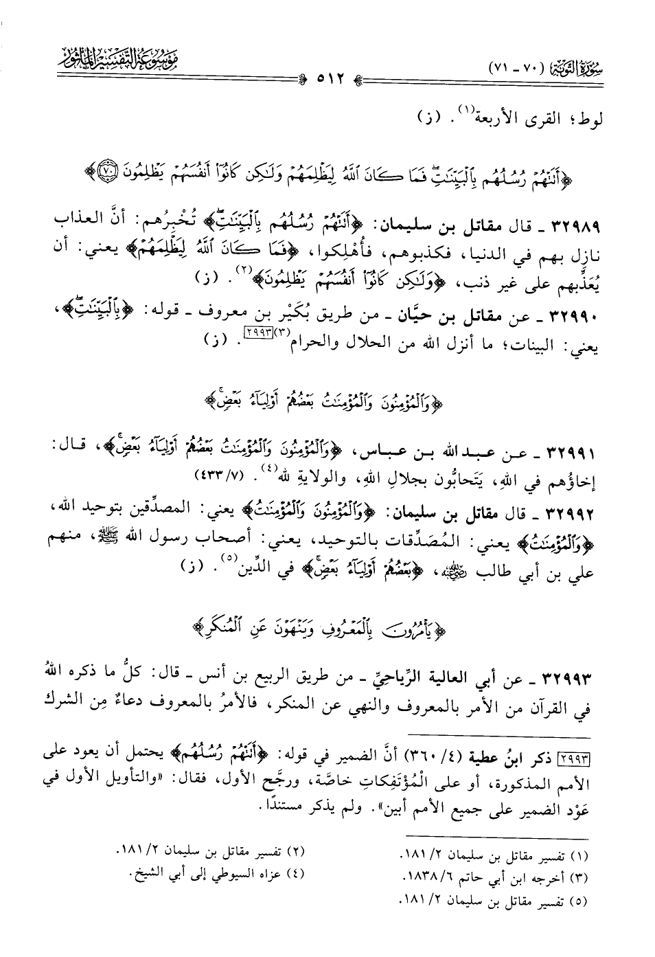 [٢٩٩٣] ذكر ابنُ عطية (٤/ ٣٦٠) أنّ الضمير في قوله: {أتَتْهُمْ رُسُلُهُمْ} يحتمل أن يعود على الأمم المذكورة، أو على المُؤْتَفِكاتِ خاصَّة، ورجَّح الأول، فقال: «والتأويل الأول في عَوْد الضمير على جميع الأمم أبين». ولم يذكر مستندًا.