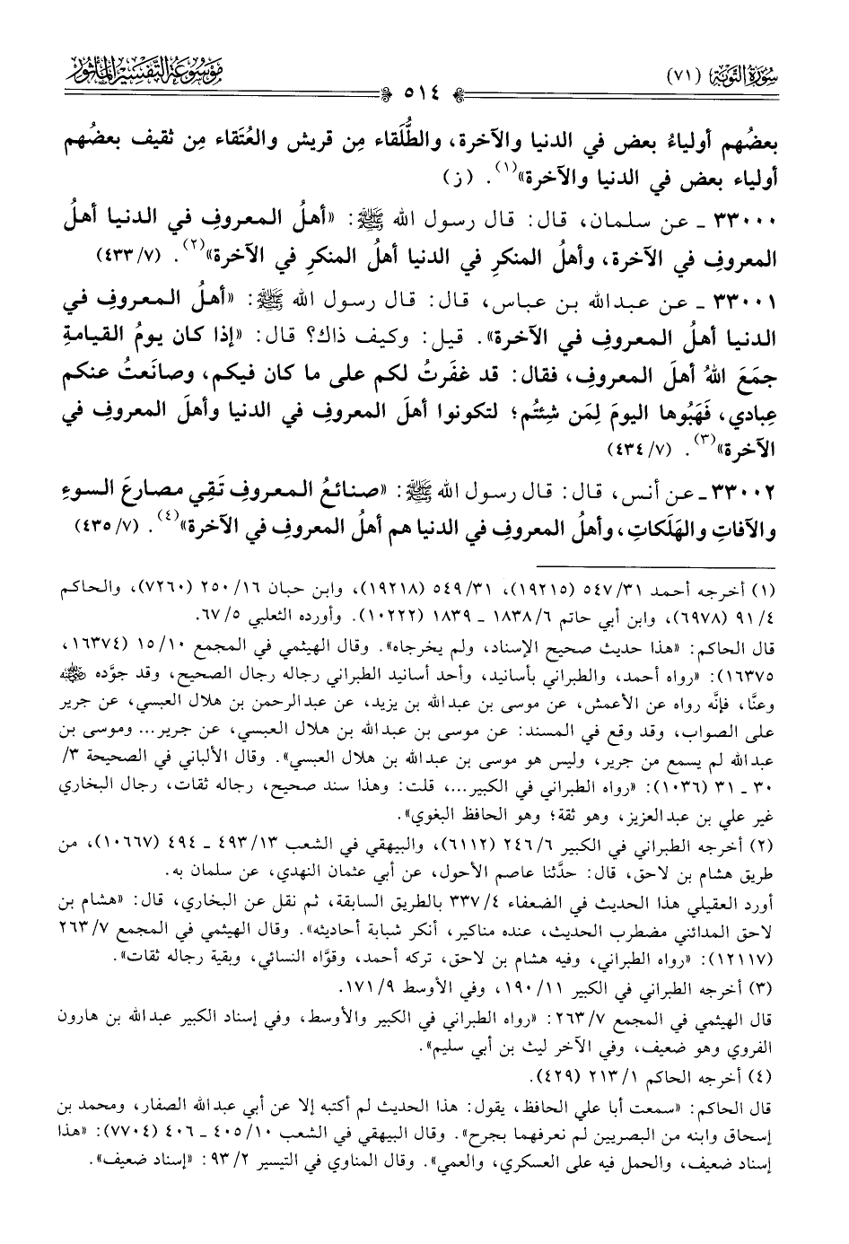 ٣٣٠٠٠ - عن سلمان، قال: قال رسول الله - صلى الله عليه وسلم -: «أهلُ المعروفِ في الدنيا أهلُ المعروفِ في الآخرة، وأهلُ المنكرِ في الدنيا أهلُ المنكرِ في الآخرة» (¬٢). (٧/ ٤٣٣)