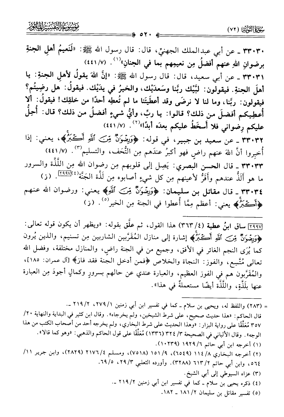 ٣٣٠٣٢ - عن سعيد بن جبير، في قوله: {ورِضْوانٌ مِنَ اللهِ أكْبَرُ}، يعني: إذا أُخبِروا أنّ اللهَ عنهم راضٍ فهو أكبرُ عندَهم مِن التُّحَف، والتسليم (¬٣). (٧/ ٤٤١)