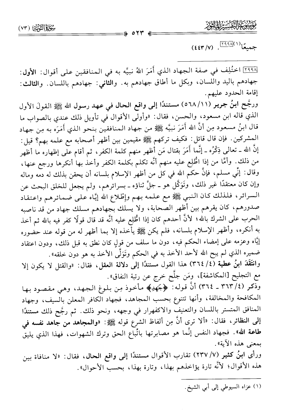 وذكر (٤/ ٣٦٣ - ٣٦٤) أنّ قوله: {جاهِدِ} مأخوذ مِن بلوغ الجهد، وهي مقصود بها المكافحة والمخالفة، وأنها تتنوع بحسب المجاهد، فجهاد الكافر المعلن بالسيف، وجهاد المنافق المتستر باللسان والتعنيف والاكفهرار في وجهه، ونحو ذلك. ثم رجَّح ذلك مستندًا إلى النظائر، فقال: «ألا ترى أنّ مِن ألفاظ الشرع قوله - صلى الله عليه وسلم -: «والمجاهد من جاهد نفسه في طاعة الله». فجهاد النفس إنّما هو مصابرتها باتِّباع الحق وترك الشهوات، فهذا الذي يليق بمعنى هذه الآية».