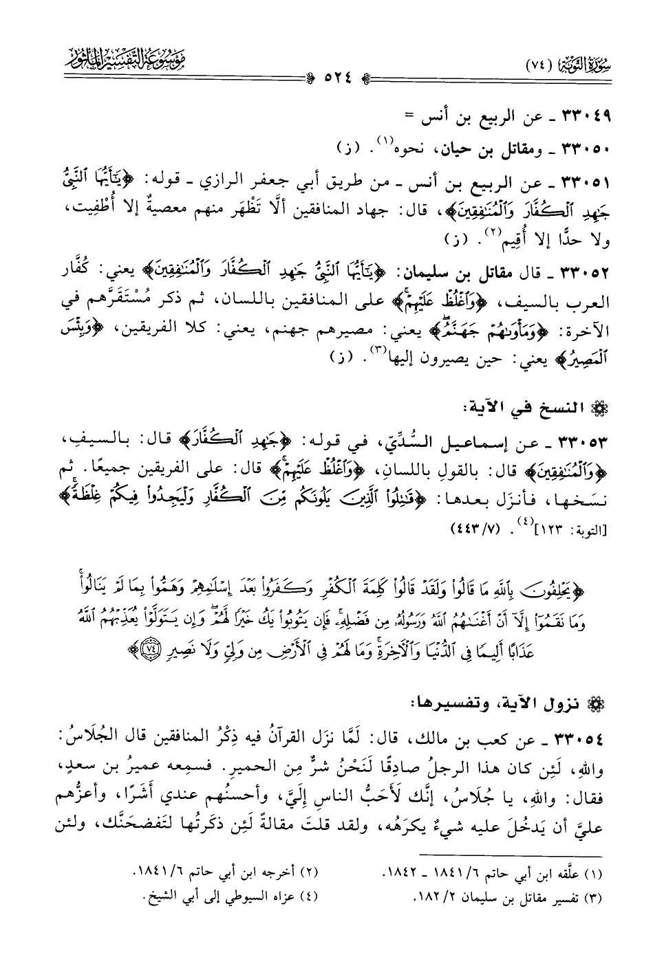 ٣٣٠٥٣ - عن إسماعيل السُّدِّيّ، في قوله: {جاهِدِ الكُفّارَ} قال: بالسيفِ، {والمنافِقِينَ} قال: بالقولِ باللسانِ، {واغْلُظْ عَلَيهِم} قال: على الفريقين جميعًا. ثم نسَخها، فأنزَل بعدها: {قاتِلُوا الَّذِينَ يَلُونَكُم مِنَ الكُفّارِ وليَجِدُوا فِيكُم غِلظَةً} [التوبة: ١٢٣] (¬٤). (٧/ ٤٤٣)