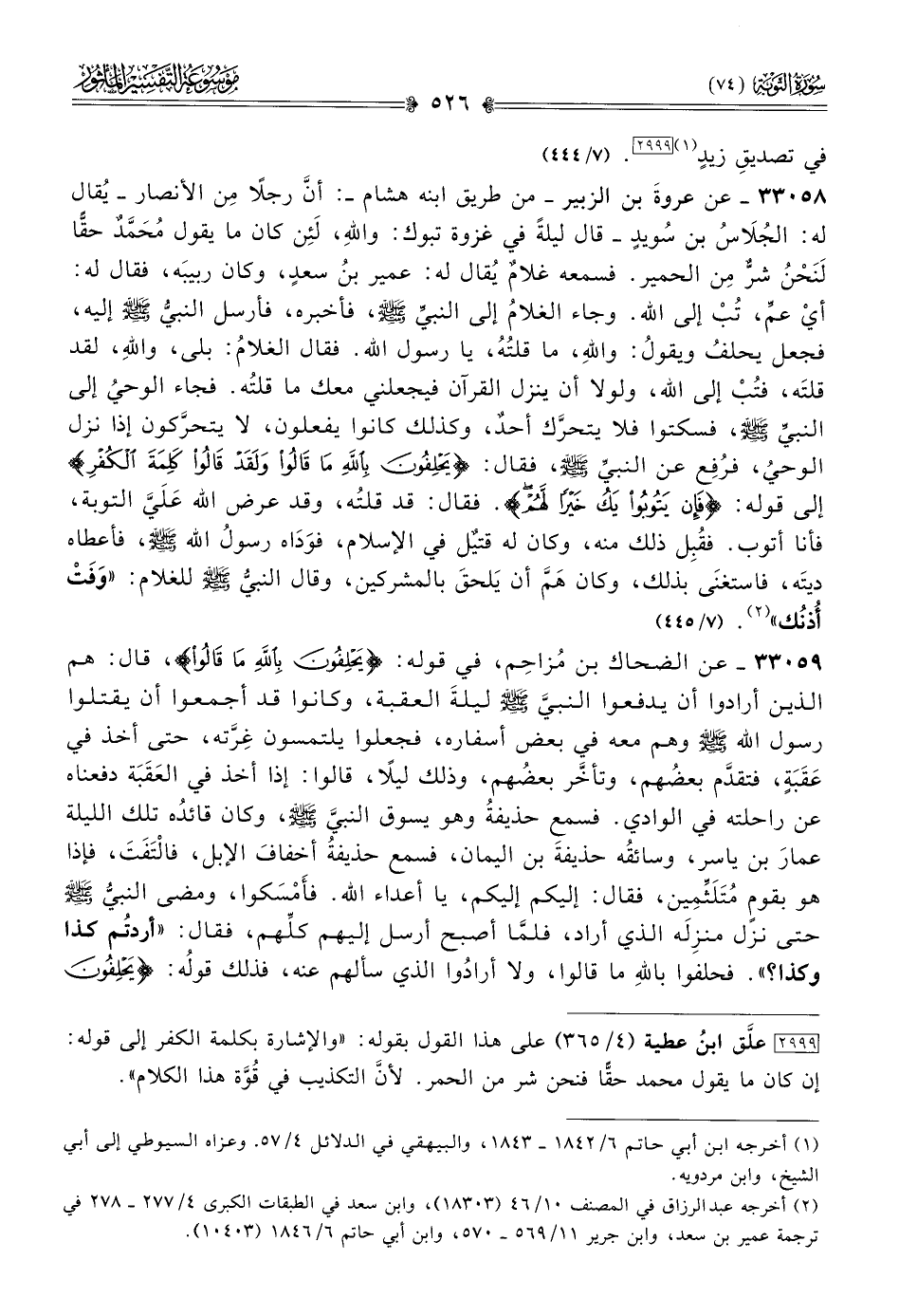 ٣٣٠٥٩ - عن الضحاك بن مُزاحِم، في قوله: {يحلفون بالله ما قالوا}، قال: هم الذين أرادوا أن يدفعوا النبيَّ - صلى الله عليه وسلم - ليلةَ العقبة، وكانوا قد أجمعوا أن يقتلوا رسول الله - صلى الله عليه وسلم - وهم معه في بعض أسفاره، فجعلوا يلتمسون غِرَّته، حتى أخذ في عَقَبَةٍ، فتقدَّم بعضُهم، وتأخَّر بعضُهم، وذلك ليلًا، قالوا: إذا أخذ في العَقَبَة دفعناه عن راحلته في الوادي. فسمع حذيفةُ وهو يسوق النبيَّ - صلى الله عليه وسلم -، وكان قائدُه تلك الليلة عمارَ بن ياسر، وسائقُه حذيفةَ بن اليمان، فسمع حذيفةُ أخفافَ الإبل، فالتَفَتَ، فإذا هو بقومٍ مُتَلَثِّمِين، فقال: إليكم إليكم، يا أعداء الله. فأَمْسَكوا، ومضى النبيُّ - صلى الله عليه وسلم - حتى نزل منزِلَه الذي أراد، فلمّا أصبح أرسل إليهم كلِّهم، فقال: «أردتُم كذا وكذا؟». فحلفوا باللهِ ما قالوا، ولا أرادُوا الذي سألهم عنه، فذلك قولُه: {يحلفون