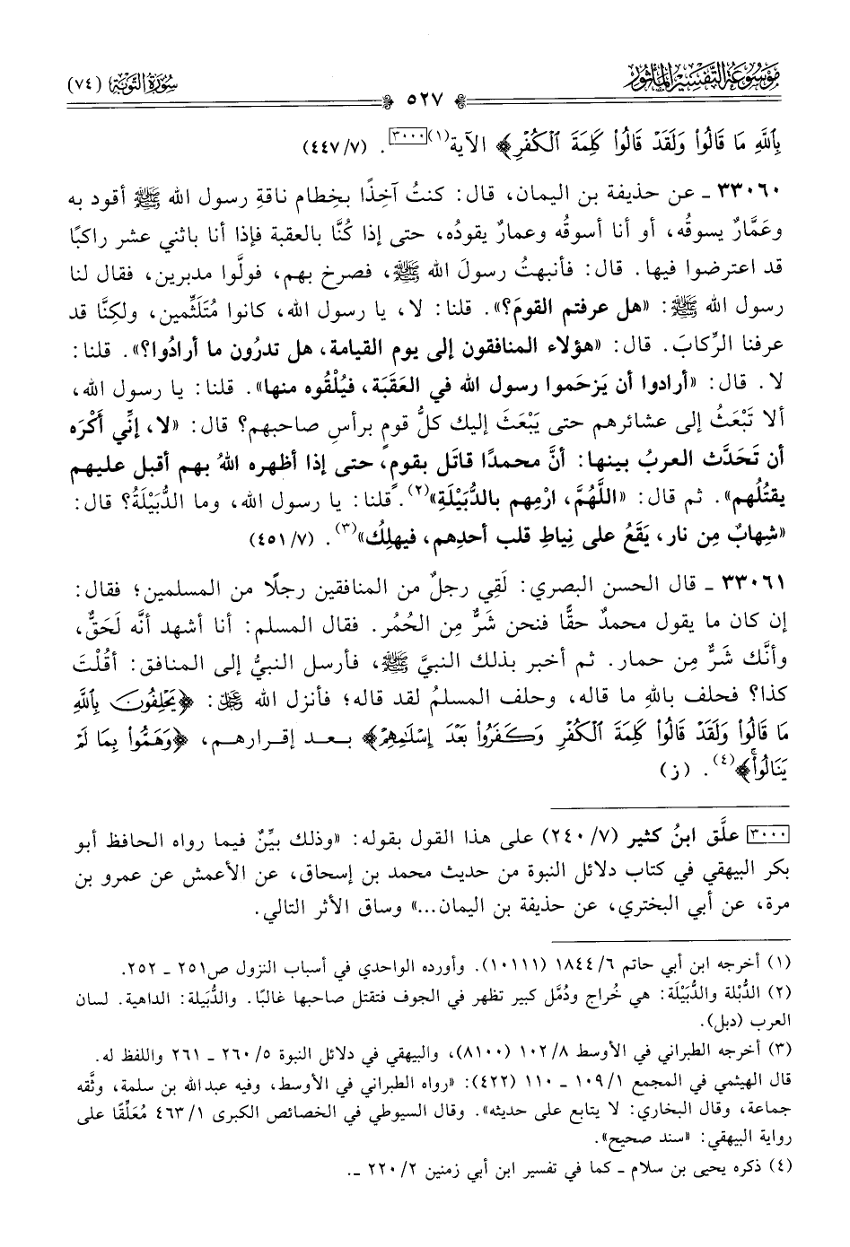 [٣٠٠٠] علَّق ابنُ كثير (٧/ ٢٤٠) على هذا القول بقوله: «وذلك بين فيما رواه الحافظ أبو بكر البيهقي في كتاب دلائل النبوة من حديث محمد بن إسحاق، عن الأعمش عن عمرو بن مرة، عن أبي البختري، عن حذيفة بن اليمان ... » وساق الأثر التالي.