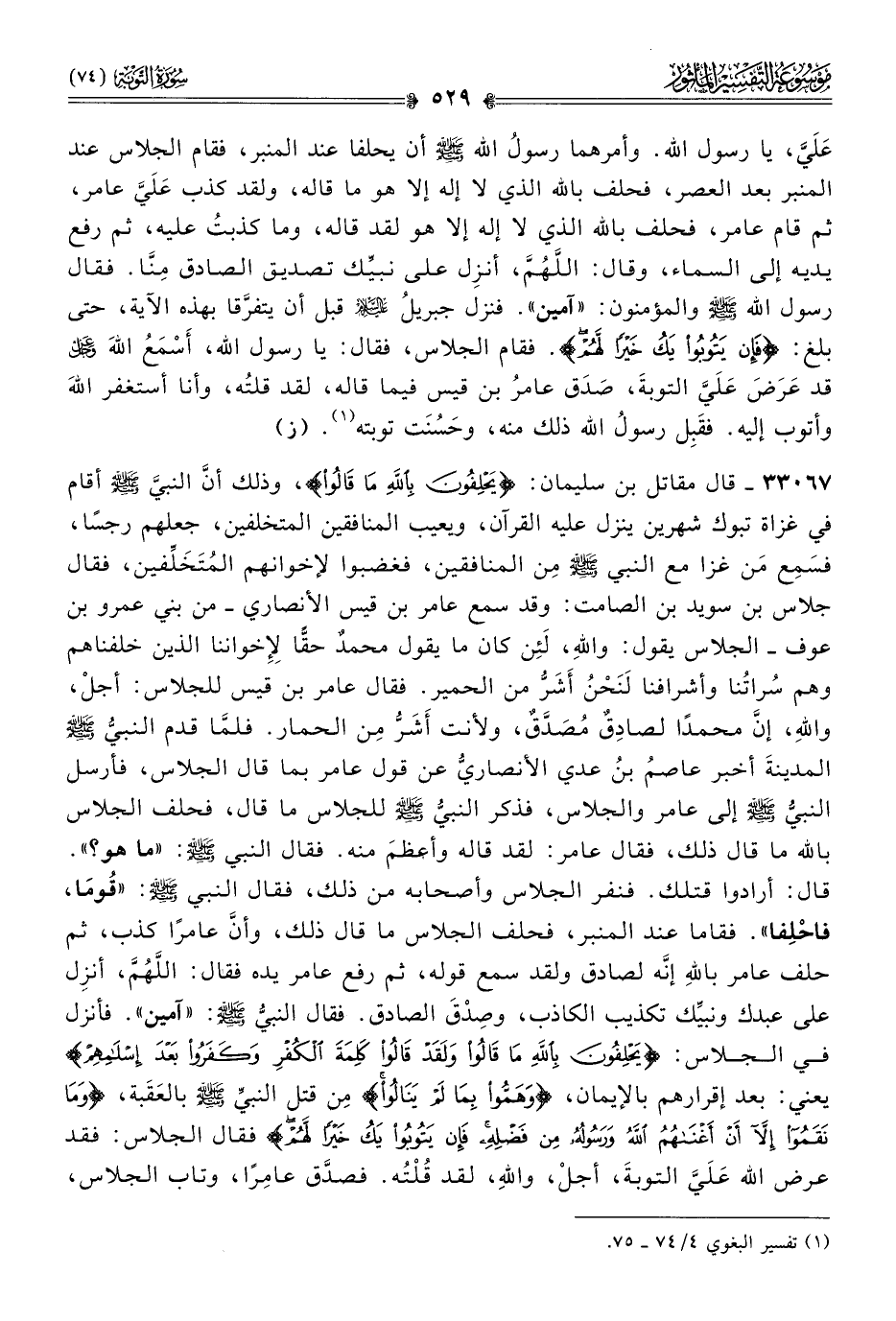 ٣٣٠٦٧ - قال مقاتل بن سليمان: {يَحْلِفُونَ بِاللَّهِ ما قالُوا}، وذلك أنّ النبيَّ - صلى الله عليه وسلم - أقام في غزاة تبوك شهرين ينزل عليه القرآن، ويعيب المنافقين المتخلفين، جعلهم رجسًا، فسَمِع مَن غزا مع النبي - صلى الله عليه وسلم - مِن المنافقين، فغضبوا لإخوانهم المُتَخَلِّفين، فقال جلاس بن سويد بن الصامت: وقد سمع عامر بن قيس الأنصاري -من بني عمرو بن عوف- الجلاس يقول: واللهِ، لَئِن كان ما يقول محمدٌ حقًّا لِإخواننا الذين خلفناهم وهم سُراتُنا وأشرافنا لَنَحْنُ أشَرُّ من الحمير. فقال عامر بن قيس للجلاس: أجلْ، واللهِ، إنّ محمدًا لصادِقٌ مُصَدَّقٌ، ولأنت أشَرُّ مِن الحمار. فلمّا قدم النبيُّ - صلى الله عليه وسلم - المدينةَ أخبر عاصمُ بنُ عدي الأنصاريُّ عن قول عامر بما قال الجلاس، فأرسل النبيُّ - صلى الله عليه وسلم - إلى عامر والجلاس، فذكر النبيُّ - صلى الله عليه وسلم - للجلاس ما قال، فحلف الجلاس بالله ما قال ذلك، فقال عامر: لقد قاله وأعظمَ منه. فقال النبي - صلى الله عليه وسلم -: «ما هو؟». قال: أرادوا قتلك. فنفر الجلاس وأصحابه من ذلك، فقال النبي - صلى الله عليه وسلم -: «قُوما، فاحْلِفا». فقاما عند المنبر، فحلف الجلاس ما قال ذلك، وأنّ عامرًا كذب، ثم حلف عامر باللهِ إنّه لصادق ولقد سمع قوله، ثم رفع عامر يده فقال: اللَّهُمَّ، أنزِل على عبدك ونبيِّك تكذيب الكاذب، وصِدْقَ الصادق. فقال النبيُّ - صلى الله عليه وسلم -: «آمين». فأنزل في الجلاس: {يَحْلِفُونَ بِاللَّهِ ما قالُوا ولَقَدْ قالُوا كَلِمَةَ الكُفْرِ وكَفَرُوا بَعْدَ إسْلامِهِمْ} يعني: بعد إقرارهم بالإيمان، {وهَمُّوا بِما لَمْ يَنالُوا} مِن قتل النبيِّ - صلى الله عليه وسلم - بالعَقَبة، {وما نَقَمُوا إلّا أنْ أغْناهُمُ اللَّهُ ورَسُولُهُ مِن فَضْلِهِ فَإنْ يَتُوبُوا يَكُ خَيْرًا لَهُمْ} فقال الجلاس: فقد عرض الله عَلَيَّ التوبةَ، أجلْ، واللهِ، لقد قُلْتُه. فصدَّق عامِرًا، وتاب الجلاس،