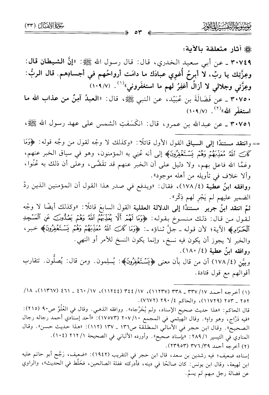 ٣٠٧٥٠ - عن فَضالَةَ بن عُبَيْد، عن النبي - صلى الله عليه وسلم -، قال: «العبدُ آمِنٌ من عذاب الله ما استغفَر الله» (¬٢). (٧/ ١٠٩)