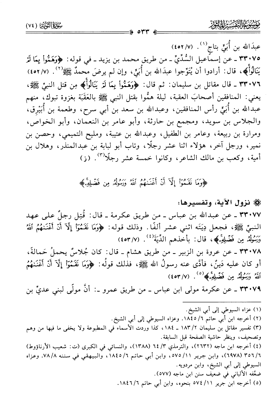 ٣٣٠٧٧ - عن عبد الله بن عباس -من طريق عكرمة- قال: قُتِل رجلٌ على عهد النبيِّ - صلى الله عليه وسلم -، فجعل دِيَتَه اثني عشر ألفًا. وذلك قوله: {وما نقمُوا إلّا أن أغناهُمُ الله ورسوُلُهُ من فضلِهِ}، قال: بأخذهم الدِّيَةَ (¬٤). (٧/ ٤٥٣)