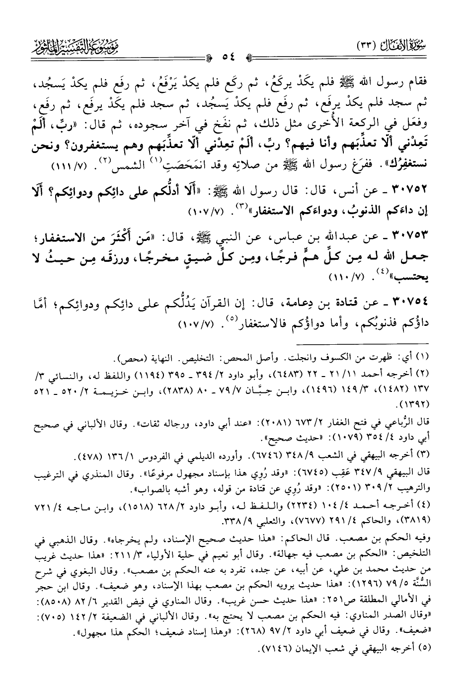 ٣٠٧٥٢ - عن أنس، قال: قال رسول الله - صلى الله عليه وسلم -: «ألا أدلُّكم على دائِكم ودوائِكم؟ ألا إن داءَكم الذنوبُ، ودواءَكم الاستغفار» (¬٣). (٧/ ١٠٧)