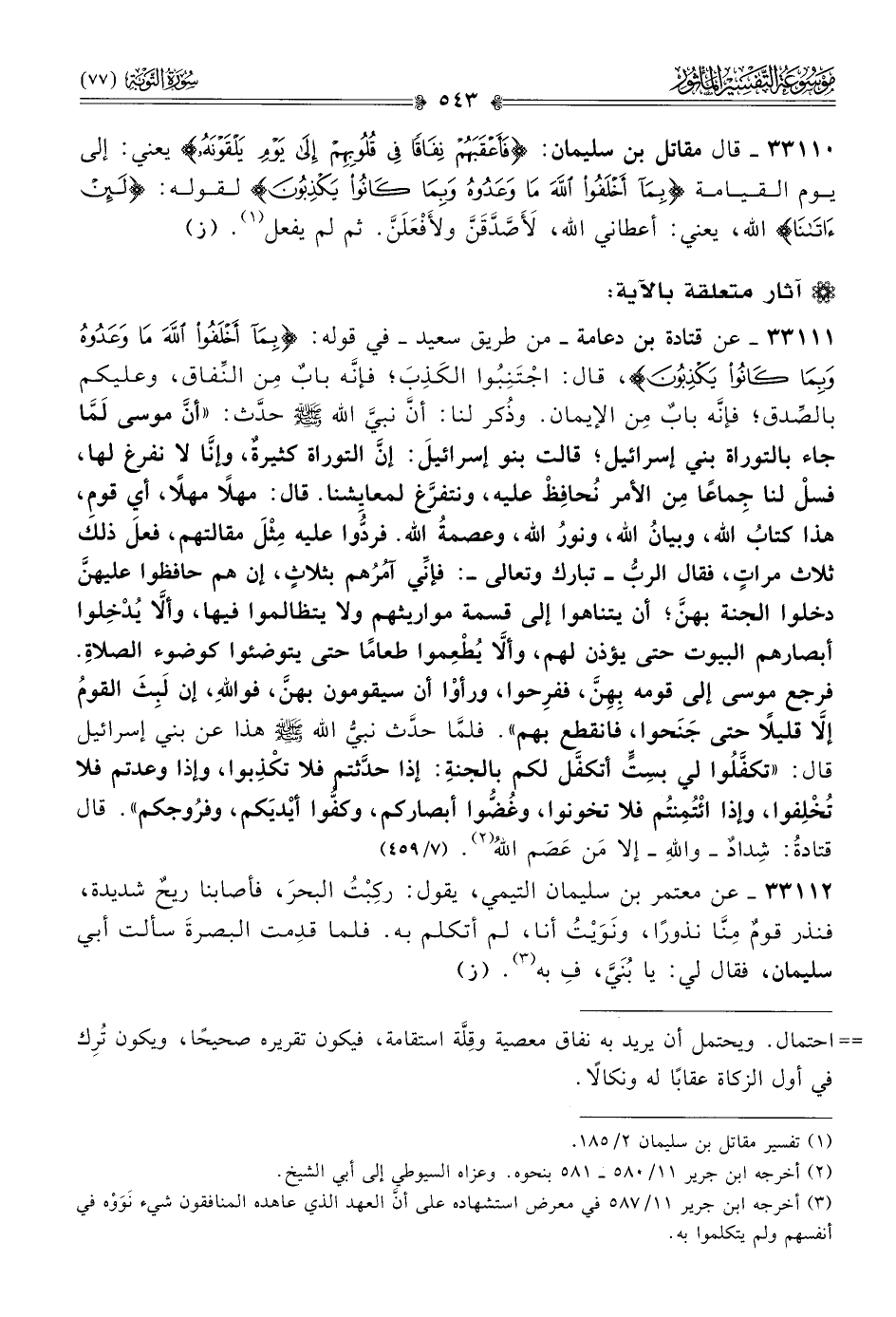٣٣١١٠ - قال مقاتل بن سليمان: {فَأَعْقَبَهُمْ نِفاقًا فِي قُلُوبِهِمْ إلى يَوْمِ يَلْقَوْنَهُ} يعني: إلى يوم القيامة {بِما أخْلَفُوا اللَّهَ ما وعَدُوهُ وبِما كانُوا يَكْذِبُونَ} لقوله: {لَئِن آتانا الله} يعني: أعطاني الله، لَأَصَّدَّقَنَّ ولأَفْعَلَنَّ. ثم لم يفعل (¬١). (ز)