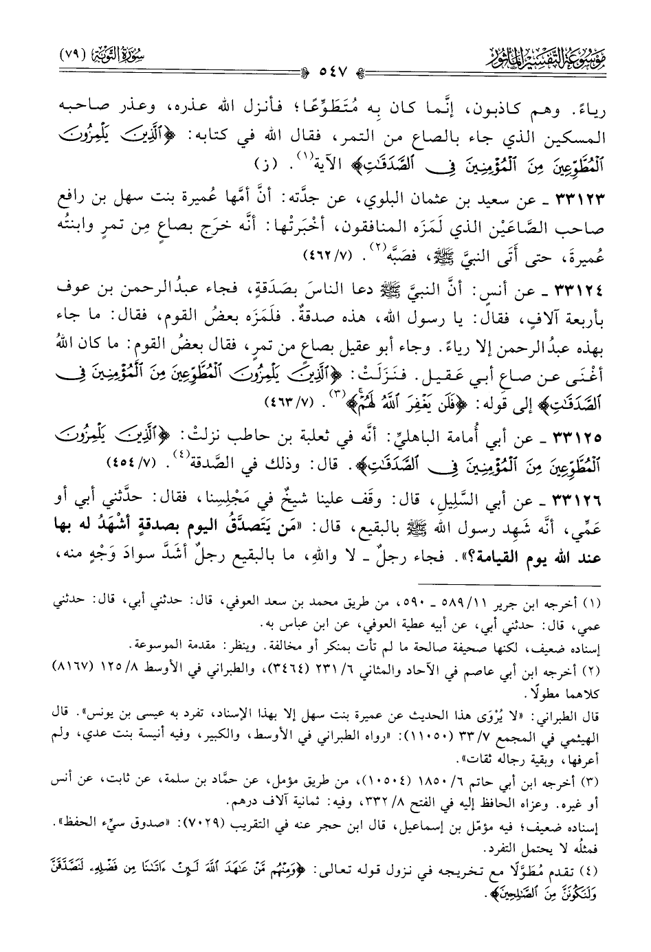 ٣٣١٢٥ - عن أبي أمامة الباهليِّ: أنّه في ثعلبة بن حاطب نزلتْ: {الذين يلمزون المطَّوعين من المؤمنينَ في الصَّدقات}. قال: وذلك في الصَّدقة (¬٤). (٧/ ٤٥٤)