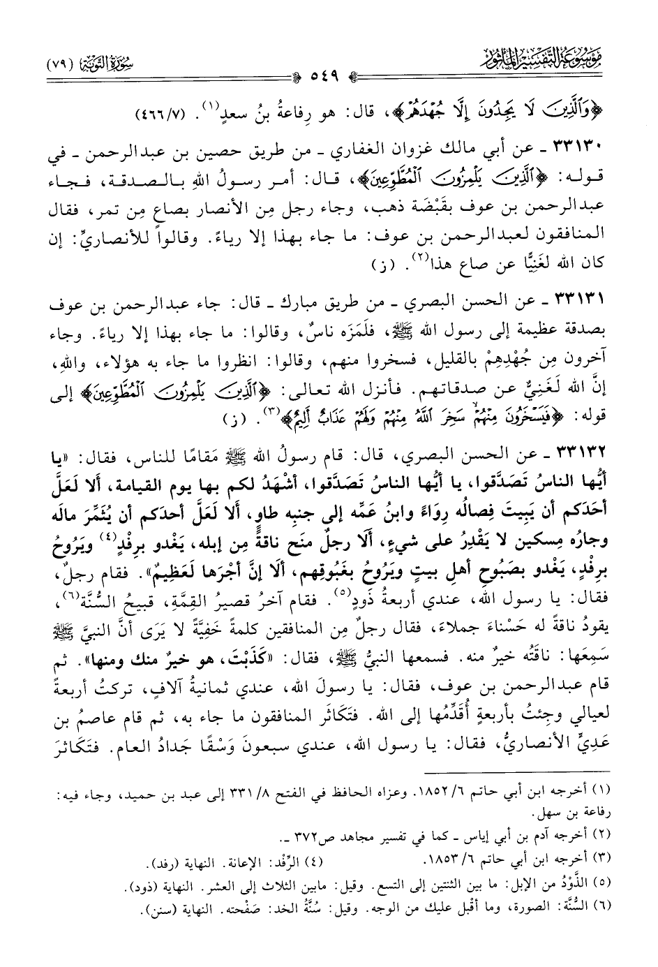 ٣٣١٣٠ - عن أبي مالك غزوان الغفاري -من طريق حصين بن عبد الرحمن- في قوله: {الذين يلمزون المطوعين}، قال: أمر رسولُ اللهِ بالصدقة، فجاء عبد الرحمن بن عوف بقَبْضَة ذهب، وجاء رجل مِن الأنصار بصاعٍ مِن تمر، فقال المنافقون لعبد الرحمن بن عوف: ما جاء بهذا إلا رياءً. وقالوا للأنصاريِّ: إن كان الله لغَنِيًّا عن صاع هذا (¬٢). (ز)