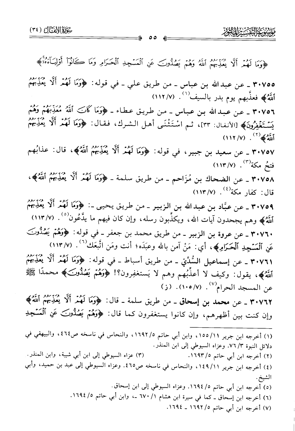 ٣٠٧٦١ - عن إسماعيل السُّدِّيّ -من طريق أسباط- في قوله: {وما لهم ألا يعذبهم الله}، يقول: وكيف لا أعذِّبُهم وهم لا يَستغفِرون؟! {وهم يصدون} محمدًا - صلى الله عليه وسلم - عن المسجد الحرام (¬٧). (٧/ ١٠٥) (ز)