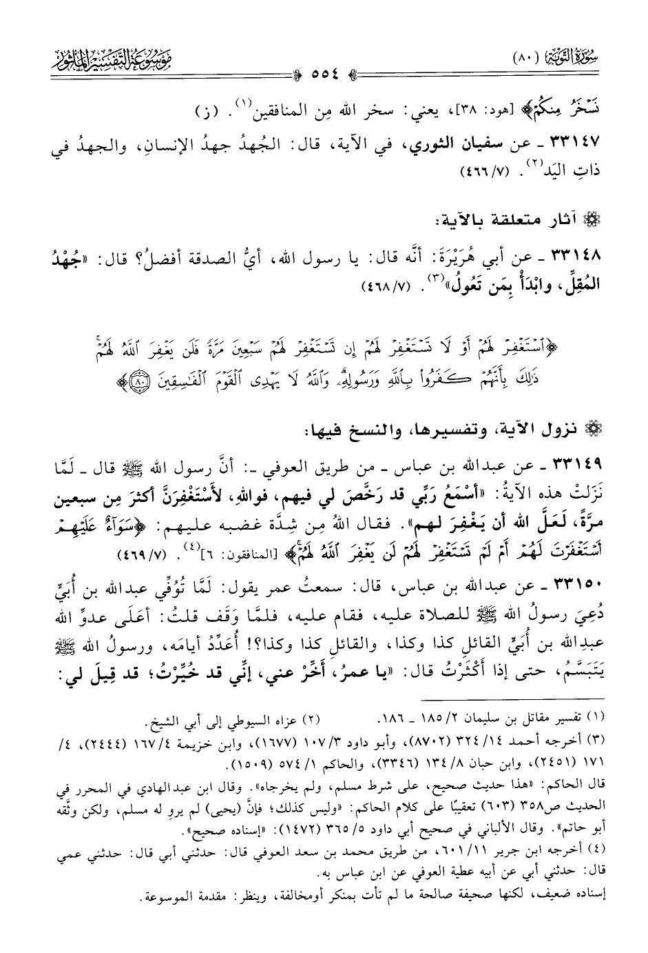 ٣٣١٤٩ - عن عبد الله بن عباس -من طريق العوفي- أنّ رسول الله - صلى الله عليه وسلم - قال: لَمّا نَزَلتْ هذه الآيةُ: «أسْمَعُ رَبِّي قد رَخَّصَ لي فيهم، فواللهِ، لأَسْتَغْفِرَنَّ أكثرَ مِن سبعين مرَّةً، لَعَلَّ الله أن يَغْفِرَ لهم». فقال اللهُ مِن شِدَّة غضبه عليهم: {سواءٌ عليهم استغفرت لهم أمْ لمْ تستغفرْ لهمْ لن يغفر الله لهُمْ} [المنافقون: ٦] (¬٤). (٧/ ٤٦٩)
