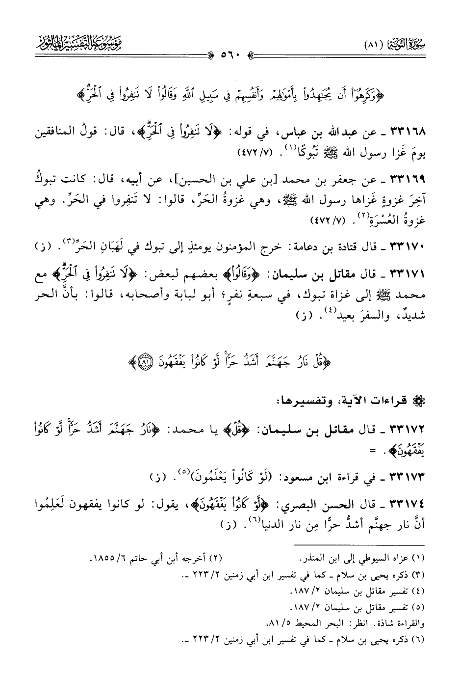 ٣٣١٦٨ - عن عبد الله بن عباس، في قوله: {لا تنفرُوا في الحرِّ}، قال: قولُ المنافقين يومَ غَزا رسول الله - صلى الله عليه وسلم - تَبُوكًا (¬١). (٧/ ٤٧٢)