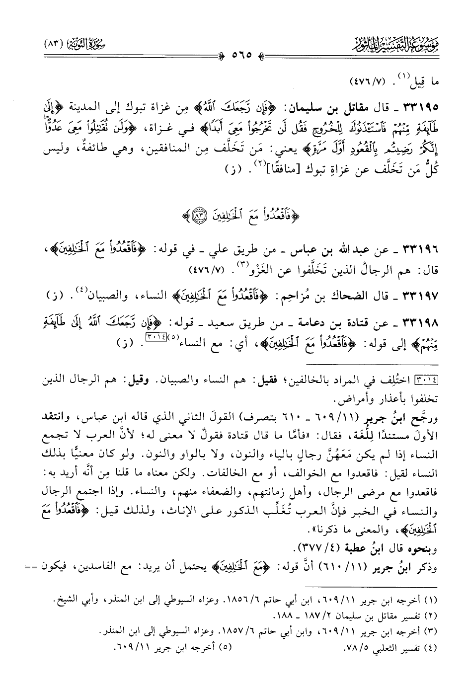 ٣٣١٩٧ - قال الضحاك بن مُزاحِم: {فاقعُدُوا مع الخالفين} النساء، والصبيان (¬٤). (ز)