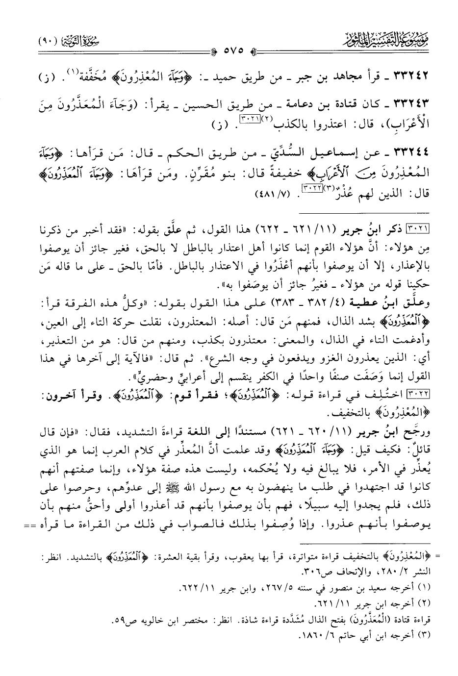 ٣٣٢٤٢ - قرأ مجاهد بن جبر -من طريق حميد-: {وَجَاءَ الْمُعَذِّرُونَ} مُخَفَّفة (¬١). (ز)