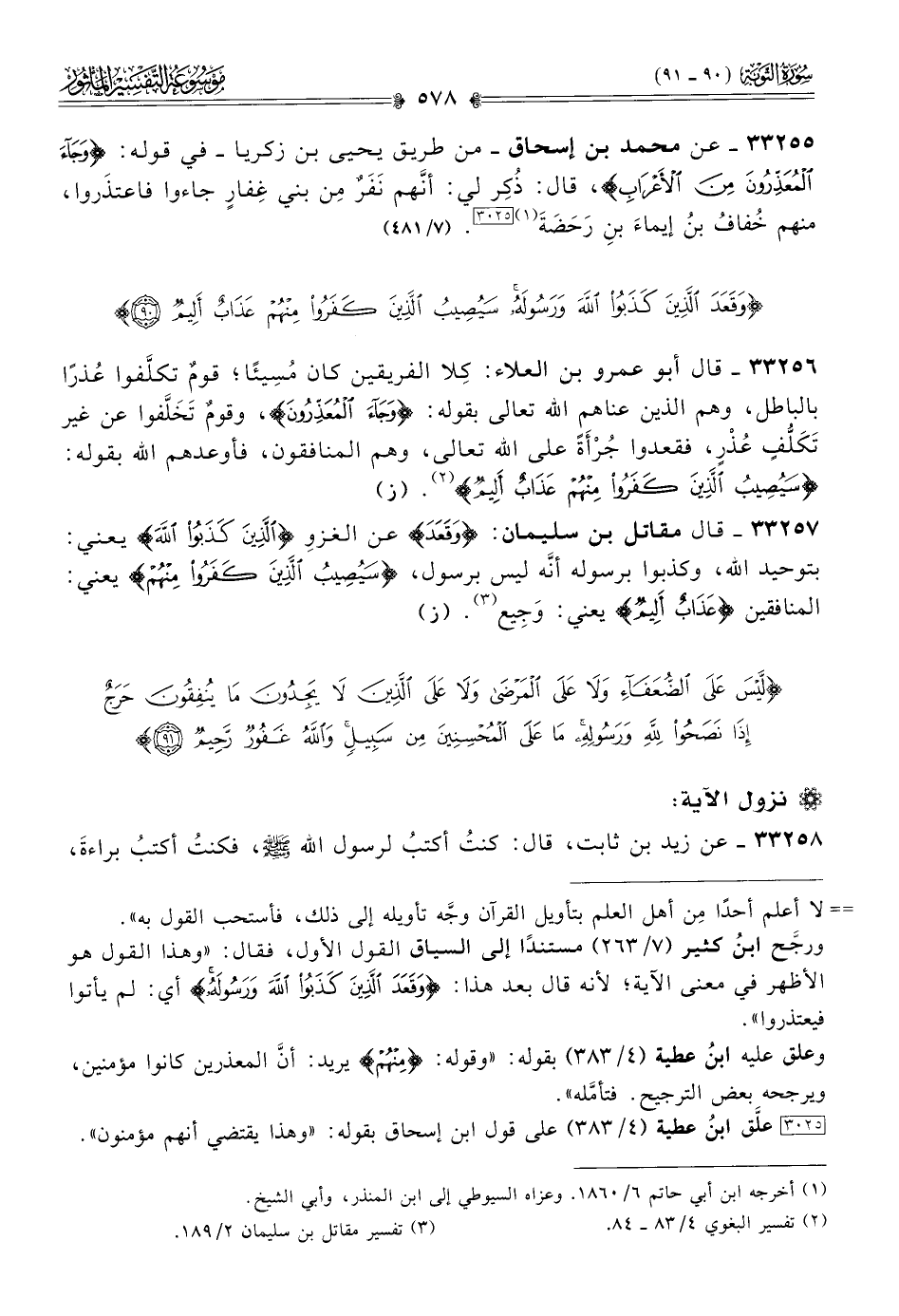 ٣٣٢٥٥ - عن محمد بن إسحاق -من طريق يحيى بن زكريا- في قوله: {وَجَاءَ الْمُعَذِّرُونَ مِنَ الْأَعْرَابِ}، قال: ذُكِر لي: أنّهم نَفَرٌ مِن بني غِفارٍ جاءوا فاعتذَروا، منهم خُفافُ بنُ إيماءَ بنِ رَحَضَةَ (¬١) [٣٠٢٥]. (٧/ ٤٨١)
