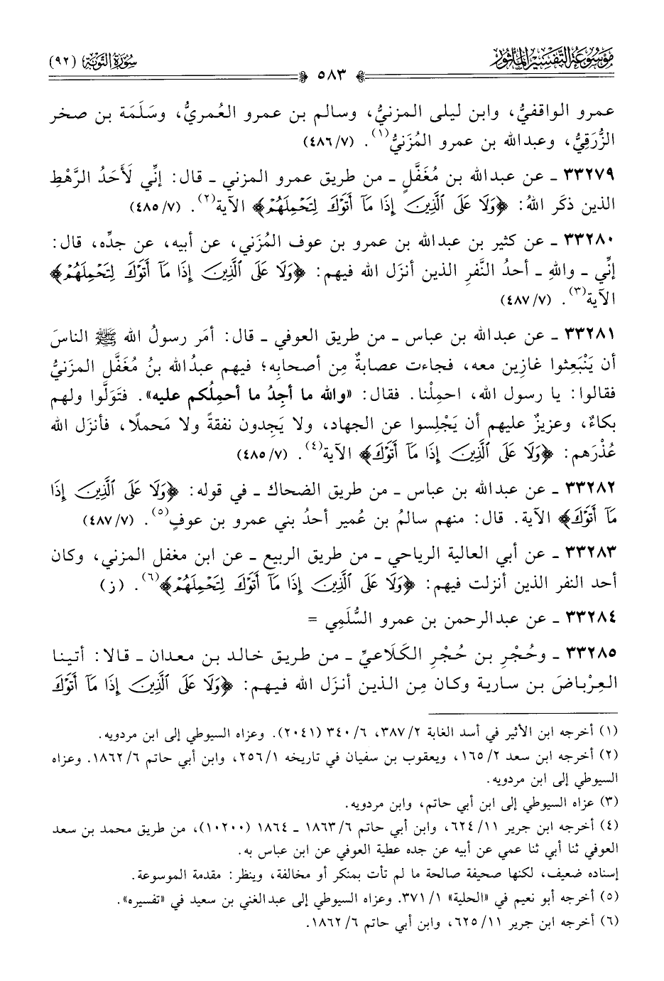 ٣٣٢٨١ - عن عبد الله بن عباس - من طريق العوفي - قال: أمَر رسولُ الله - صلى الله عليه وسلم - الناسَ أن يَنْبَعِثوا غازِين معه، فجاءت عصابةٌ مِن أصحابِه؛ فيهم عبدُ الله بنُ مُغَفَّل المزَنيُّ فقالوا: يا رسول الله، احمِلْنا. فقال: «والله ما أجِدُ ما أحمِلُكم عليه». فتَوَلَّوا ولهم بكاءٌ، وعزيزٌ عليهم أن يَجْلِسوا عن الجهاد، ولا يَجِدون نفقةً ولا مَحملًا، فأنزَل الله عُذْرَهم: {ولا على الذين إذا ما أتوكَ} الآية (¬٤). (٧/ ٤٨٥)