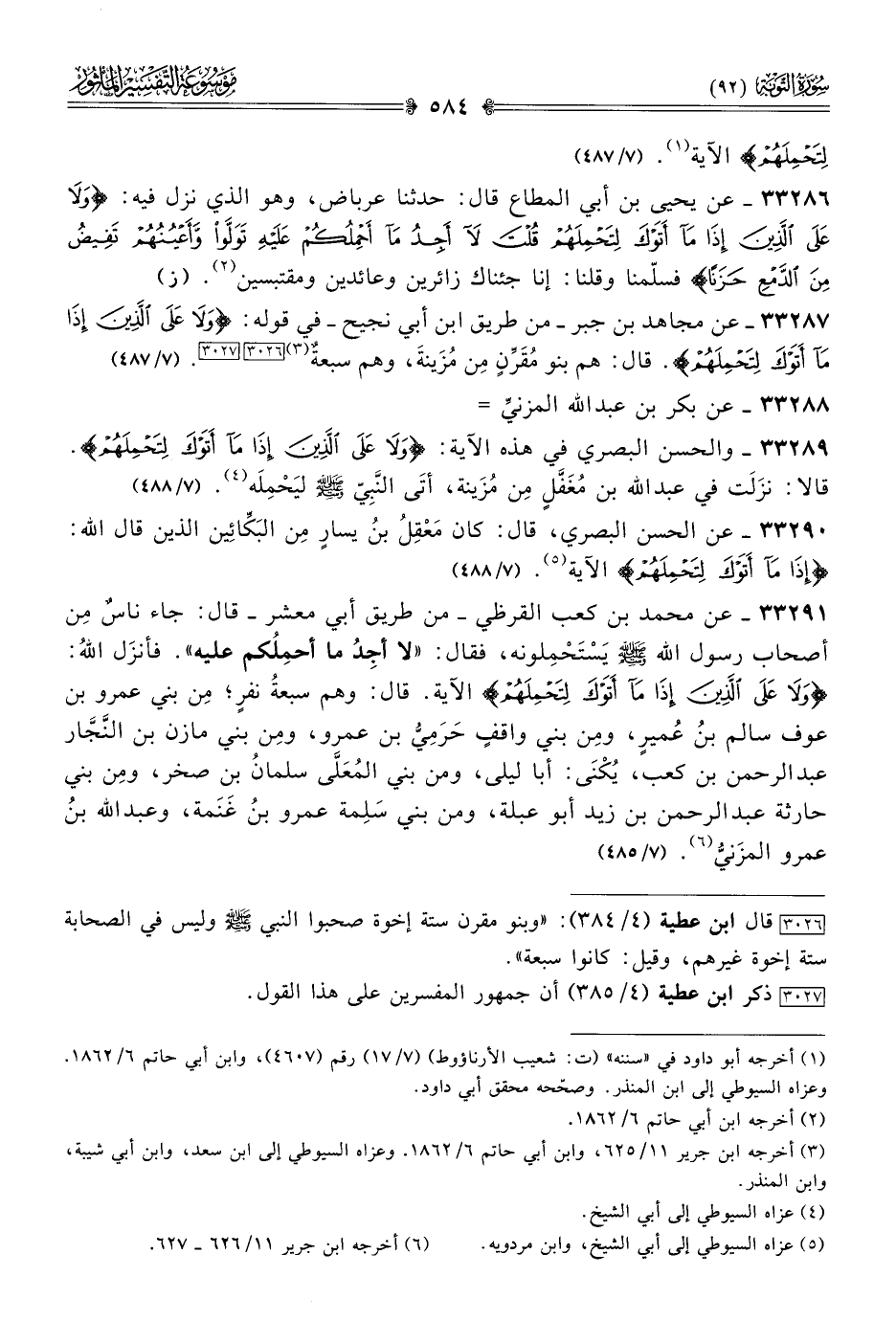 ٣٣٢٩١ - عن محمد بن كعب القرظي -من طريق أبي معشر- قال: جاء ناسٌ مِن أصحابِ رسول الله - صلى الله عليه وسلم - يَسْتَحْمِلونه، فقال: «لا أجِدُ ما أحمِلُكم عليه». فأنزَل اللهُ: {ولا على الذين إذا ما أتوك لتحملهُم} الآية. قال: وهم سبعةُ نفرٍ؛ مِن بني عمرو بن عوف سالم بنُ عُميرٍ، ومِن بني واقفٍ حَرَمِيُّ بن عمرو، ومِن بني مازن بن النَّجّار عبد الرحمن بن كعب، يُكْنى: أبا ليلى، ومن بني المُعَلّى سلمانُ بن صخر، ومِن بني حارثة عبد الرحمن بن زيد أبو عبلة، ومن بني سَلِمة عمرو بنُ غَنَمة، وعبد الله بنُ عمرو المزَنيُّ (¬٦). (٧/ ٤٨٥)